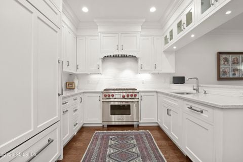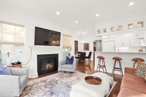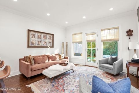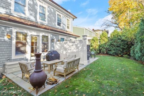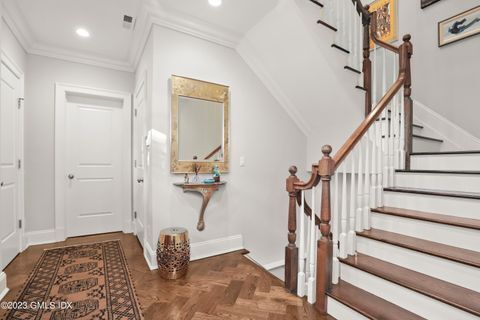 Newer construction. Sophisticated in-town Townhouse. Attached garage and extra parking. Private, fenced outdoor space with lovely terrace, and plantings and Back up generator. Elegant gourmet kitchen with quartz counter tops, Sub Zero and Wolf appliances. The property includes two (2) en suite bedrooms, each with its own private full bathroom. In addition, the home features two (2) half bathrooms for guest or common-area use. 9 foot ceilings, gas fireplace, hardwood floors and stunning molding throughout. 2nd floor laundry room. Sq. footage includes very bright and spacious, beautifully finished lower level, perfect for office, workout or studio. Abundant private storage space. Very short distance to train, the shops and restaurants of Greenwich Avenue, Equinox, and Marinas.