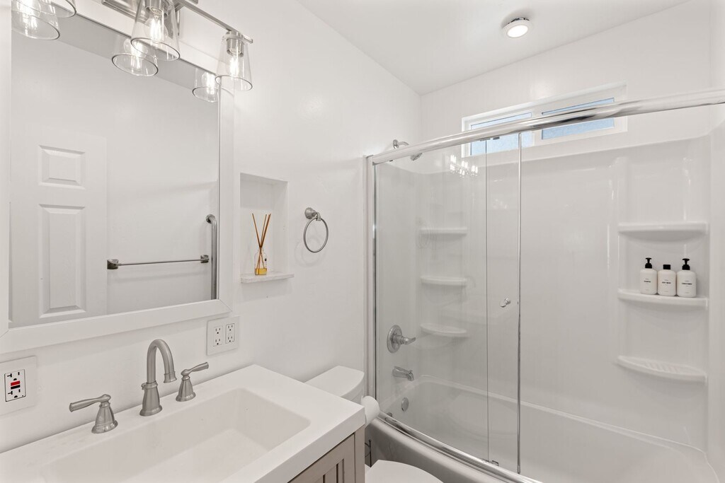 This fully remodeled 1BR/1BA cottage is nestled in coastal paradise, just moments from Carlsbad's most beautiful beaches! The open layout seamlessly connects the living area, dining space, and fully equipped kitchen, providing a comfortable and convenient space. The kitchen is fully equipped with stainless appliances and a breakfast counter with seating for 3. The bedroom, furnished with a King bed, includes an en suite bath with a full shower/tub combo and modern fixtures. Conveniently located inside the bedroom closet, you have a brand new stackable washer and dryer. From the bedroom, you'll find a private oasis in the fully fenced back patio, featuring a hot tub and seating. This cottage also includes garage parking for 1 vehicle and driveway parking for 2. HVAC/Mini split is installed for ultimate climate control and comfort. Available furnished or unfurnished. **Please note, the neighboring property is currently under the beginning stages of construction.**