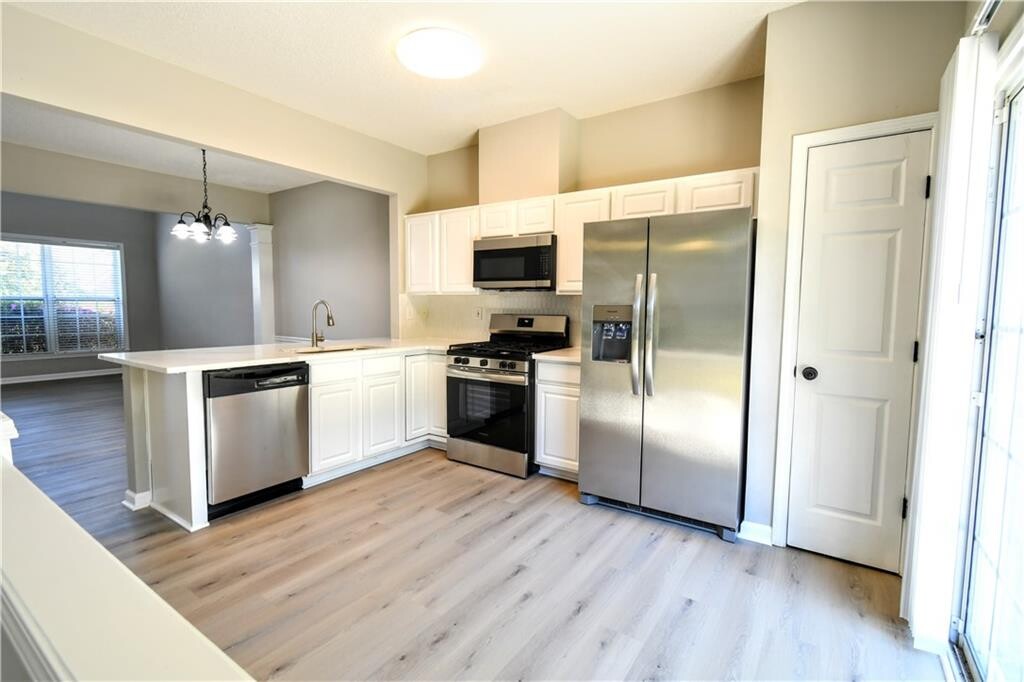 Fabulously updated 3 bedroom 2.5 bath townhome in popular Creekside at Mansell! This spacious,light-filled home is one of the most popular floor plans of the neighborhood! Greeted with an airy 2-story formal living room with new LVP throughout the level,you can step through to your open concept dining room and kitchen,leading to an additional family room with gas fireplace. The chef's kitchen is completed with brand new quartz counters,backsplash,and new appliances! Sliding doors off the kitchen lead to a peaceful patio,perfect for grilling or just a quaint table and chairs for morning coffee! A laundry room and half bath complete the main level. Upstairs is fresh with new carpet & LVP and features a large,vaulted owner's suite with a walk-in closet that goes for miles! French doors lead to the en-suite bath complete with double vanity,ample counterspace,and separate tub and shower. 2 additional bedrooms and a full bath round out the upstairs. All of this just minutes to 400,shopping and dining,etc! Home is ready for immediate move-in!