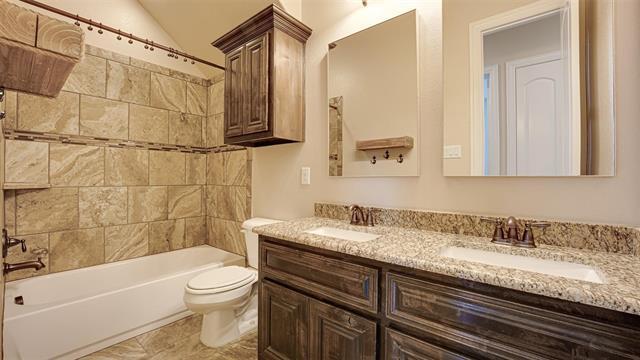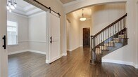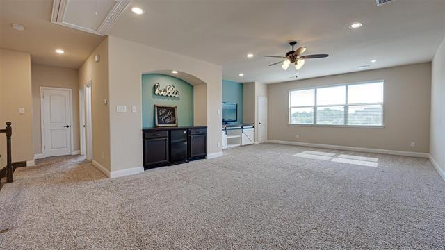 This beautiful four bedroom home features designer touches throughout. Large family room with wood floors and shiplap, barn doors to dining room and open kitchen make for a great entertaining flow. Study with closet could be 5th bedroom. Upstairs you will find a huge game room featuring built in cabinets and a reading nook, fourth bedroom and bath plus three walk in attic spaces. The large yard backs to a greenbelt with tall privacy fencing on both sides giving you plenty of privacy to enjoy the heated pool and spa complete with waterfall! There is plenty of room left in this yard for play, even with the pool.