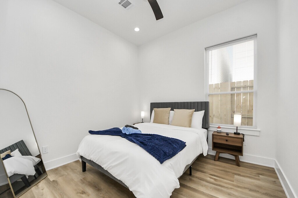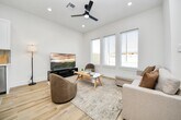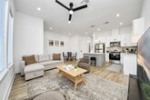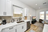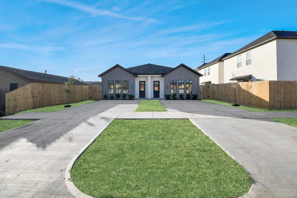 This beautifully designed new construction duplex offers modern living with thoughtful finishes and private outdoor space. Striking contemporary exterior,private driveway,and fenced yard. Inside,the open-concept layout is filed with natural light and showcases durable wood-look flooring,recessed lighting,and clean modern lines throughout. The kitchen shines with quartz countertops,a large island,soft-close cabinetry,stainless steel appliances,designer tile backsplash,and stylish pendent lights. Spacious primary bedroom with walk-in closet for extra storage. Bathrooms feature sleek vanities,quartz countertops,matte black and brass features,large mirrors,and a spa-like walk-in shower with custom title surround. Additional highlights include in-unit washer and dryers,energy efficient systems,ceiling fans,and private rear patios with fenced yards. Conveniently located near NRG and Medical Center,this property offers low-maintenance living with modern appeal. MLS# 11749281