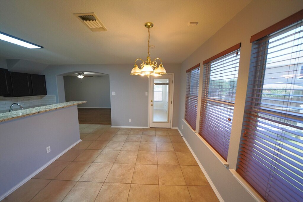 Beautifully maintained 3-bedroom, 2.5-bathroom home now available in the desirable Whisper Meadows subdivision. Step into the inviting family room, featuring laminate wood flooring and a cozy fireplace. The open-concept layout flows seamlessly into the upgraded kitchen and breakfast area. The kitchen offers granite countertops, a breakfast bar, tiled backsplash, and matching appliances, including a refrigerator. All bedrooms are located upstairs and feature durable vinyl plank flooring for ease of cleaning. The primary suite showcases high ceilings and includes a full en-suite bathroom with double vanities, a garden tub, a separate shower, and a large walk-in closet. The secondary bedrooms are spacious and include ceiling fans for added comfort. A bright Florida room leads to the outdoor deck, providing the perfect area for entertaining or relaxing. A recently installed water softener is included with the home. As a value-added convenience, our company will routinely handle both HVAC air-filter replacements and water-softener salt replenishment on a scheduled basis for the tenant, ensuring proper maintenance and optimal system performance throughout the tenancy. This property offers quick access to Interstate 35 and is just a short drive to Randolph AFB. It will be a pleasure to show.