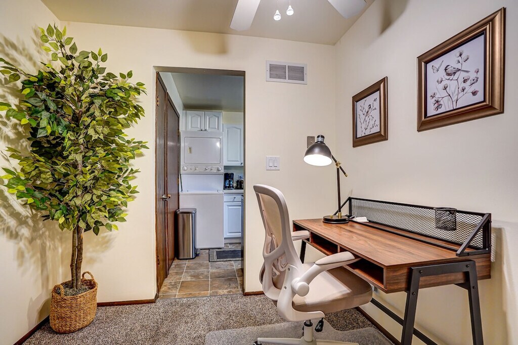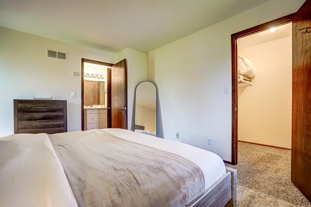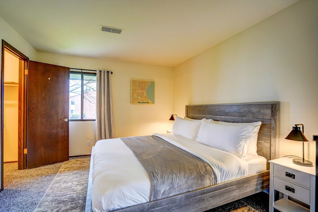 Feel at home in this second-level corner apartment. The entry door is on the first level, and you walk up into the living room. This apartment is set-up specifically for extended-stay travelers and features a king-size bed, dishwasher, in-unit washer and dryer, central A/C and heat, a balcony, a 65" Roku Smart TV, a dedicated workspace, a sectional sofa, a large closet, and a fully stocked kitchen. You can park in any of the available parking spaces. Located in an apartment complex in a residential area near the intersection of Milwaukee and Greenfield, this apartment is next door to a large park and a block away from Anytime Fitness. There are many unique restaurants in the nearby area. Aurora St Luke's is an 8-minute drive, and downtown Milwaukee is a 12-minute drive. A Metro Bus stop is a 2-minute walk from the apartment. Smoking will result in immediate cancellation of the reservation with no refund for the entire stay. The charge to remediate smoking is the actual costs of complete environmental remediation or $3,000, whichever is lower. Excessive noise violations after the first complaint will result in cancellation of the reservation with no refund. Actual replacement cost plus a restocking fee of $50.00 will be charged for missing or destroyed fixtures or personal property. Actual costs of complete environmental remediation or $3,000, whichever is lower, will be charged for pets on the premises without advance written permission. Includes a dedicated workspace. [SI]