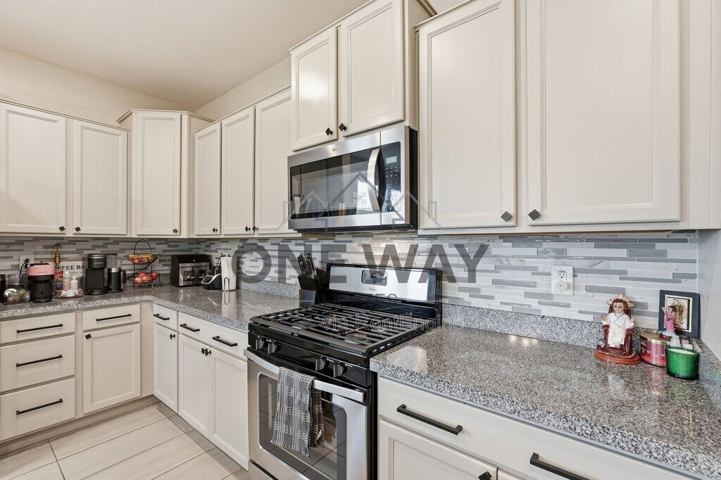 This well-maintained 1,623 sq ft home in Buckeye checks all the boxes. The open-concept layout features a bright living and dining area flowing into a fully equipped kitchen with granite countertops, white cabinetry, a large island, gas range, and stainless steel appliances. The primary suite includes a walk-in closet and a private en suite with dual sinks and a glass walk-in shower. Additional bedrooms offer carpet, ceiling fans, and generous closets. A bonus flex room works perfectly as an office or extra bedroom. You'll also find an interior laundry room, a 2-car garage with overhead storage, and two full bathrooms. Out back, enjoy a covered patio, no maintenance artificial turf, and a fully fenced private yard. The home is owner-occupied and exceptionally well cared for. By submitting your information on this page you consent to being contacted by the Property Manager and RentEngine via SMS, phone, or email.