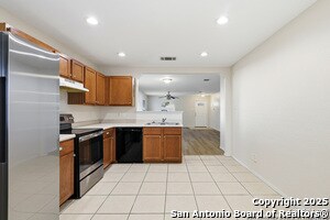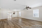 Single-story home located in the desirable Bulverde Creek subdivision. Step inside to discover vinyl plank flooring throughout the main living areas and bedrooms-there is no carpet in this home. The open-concept layout creates a seamless flow, featuring a spacious living area with a designated dining space and an eat-in kitchen, ideal for both everyday living and entertaining. For added convenience, the home includes a refrigerator for an easy move-in experience. The primary suite is a private retreat offering a walk-in closet and an en suite with double vanities. Outdoors, enjoy a large yard and a covered patio, perfect for relaxing or hosting guests. This Bulverde Creek home is move-in ready and offers comfort, style, and convenience.