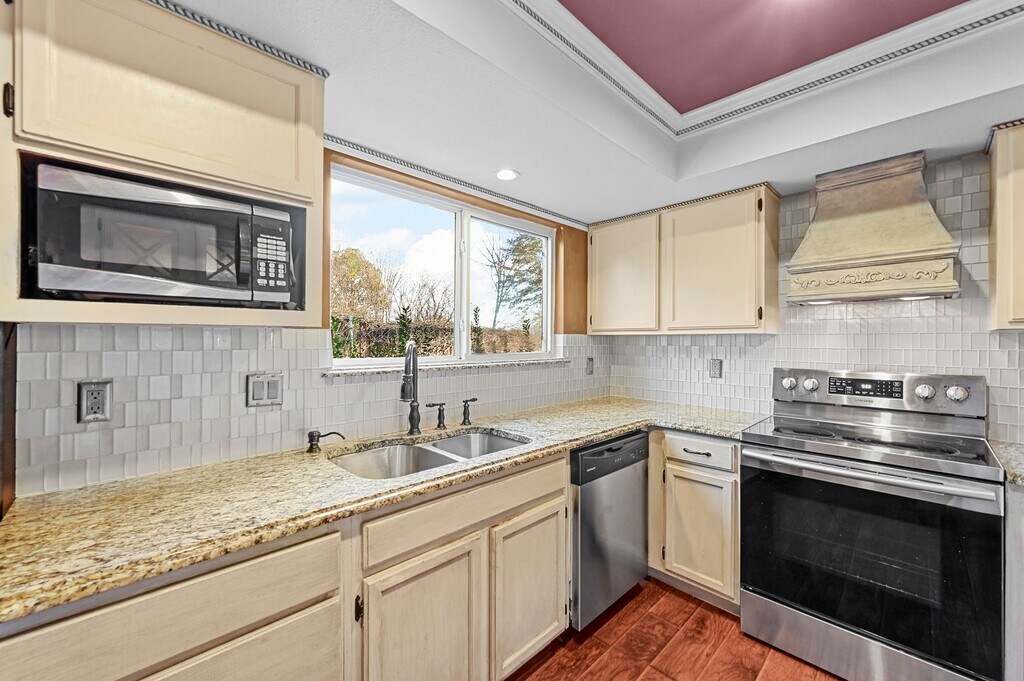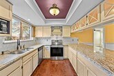 Welcome to this beautifully updated home, featuring a gas-starting, wood-burning brick fireplace that stretches up to the vaulted ceiling, creating a warm and inviting atmosphere. The kitchen is a chef’s dream, equipped with a flat cooktop oven, dishwasher, and refrigerator, all complemented by elegant granite countertops and a striking backsplash. Enjoy seamless indoor-outdoor living with double wood decks accessible from each bedroom, perfect for relaxing or entertaining. Additionally, a charming patio off the bonus room provides a cozy space ideal for a breakfast nook or additional lounging area. The property boasts a mature shade tree, adding character and comfort to the outdoor space, along with ample storage. This home is a true gem, combining modern updates with timeless charm.