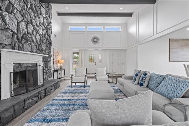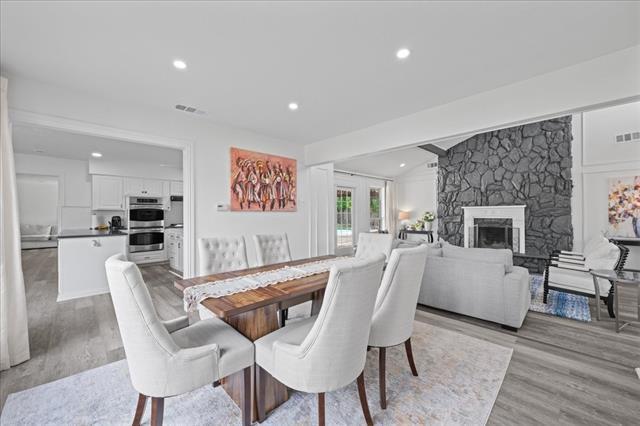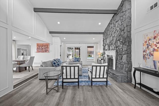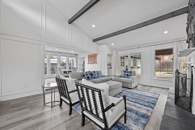 Updated 4-bedroom, 3-bath home situated on a quiet cul-de-sac, offering space, style, and ideal functionality for everyday living and entertaining. This move-in ready home features an open and inviting layout with vaulted ceilings, exposed beams, and a beautiful stone fireplace as the focal point of the main living area. Large windows bring in natural light and showcase views of the backyard and pool. The kitchen is designed for both convenience and entertaining, featuring an island, stainless steel appliances, including a double oven and dishwasher, along with generous cabinet and counter space. A massive game room and additional living area with a wet bar, full bath, and backyard access provide endless possibilities for hosting or relaxing. The primary suite offers a private retreat with its own fireplace, room for a sitting area, and direct access to the backyard. The ensuite bath includes dual vanities, a soaking tub, separate waterfall shower, and a spacious walk-in closet. Enjoy outdoor living with a diving pool, extended covered patio, and built-in grill—perfect for gatherings. Additional features include a large lot, 2-car garage, and convenient access to Hwy 161, shopping, and dining.