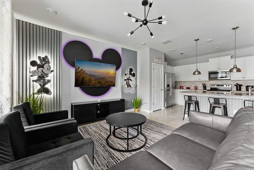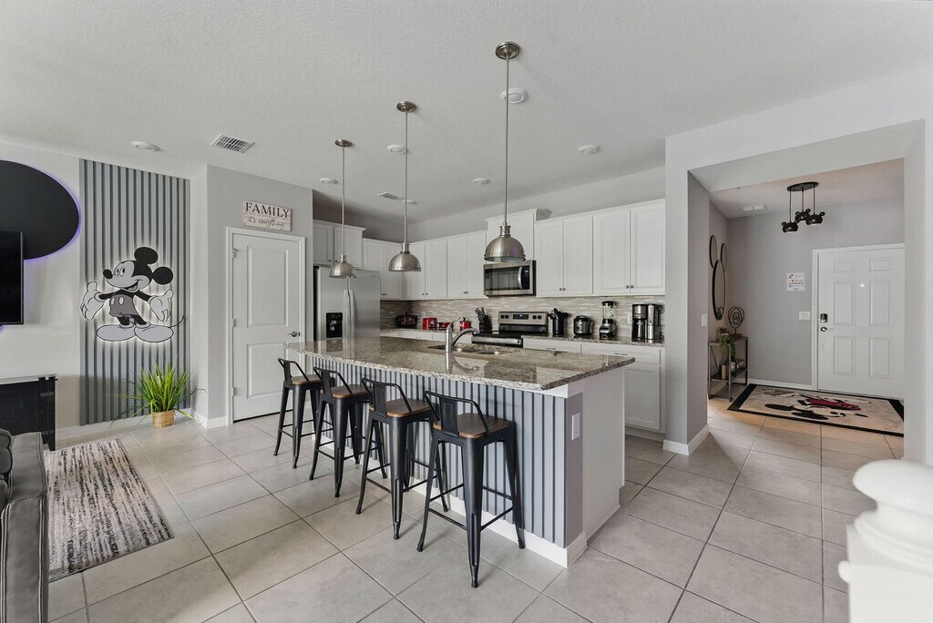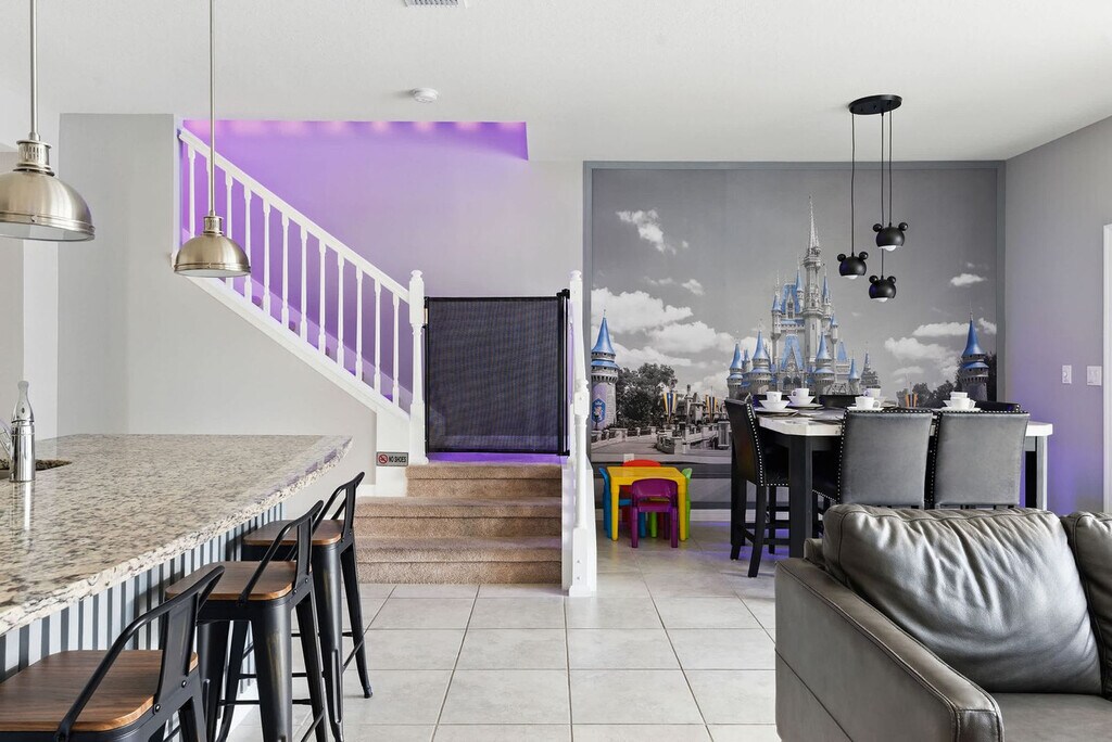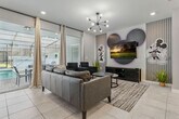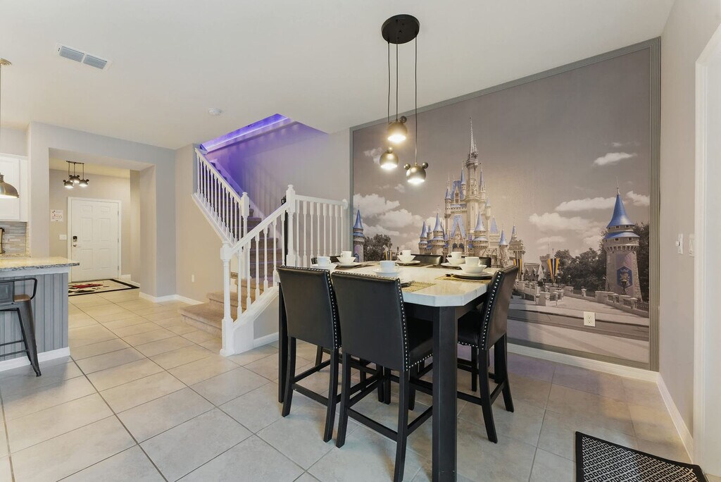 Step into a world of fantasy and fun in this 5-bedroom Windsor Island home, where comfort and entertainment await the whole family. Enjoy a Mickey-themed living room, a Star Wars family room, and bedrooms inspired by Frozen, Mario Bros, and Avengers. With a private pool and full resort amenities, this spacious layout is a perfect escape to create magical memories. Step into a world of magic and imagination in this stunning 5-bedroom vacation home, where every room is a new adventure. From the Mickey-themed living room to the castle-inspired dining area, fantasy fills every corner. Kids and adults alike will love the Frozen, Avengers, and Mario Bros bedrooms, while the upstairs Star Wars family room offers an out-of-this-world movie night experience. The open-plan layout features a fully equipped kitchen and spacious living areas perfect for relaxing after a day of fun. Step outside to your private heatable pool with lounge chairs and a half bathroom nearby, your personal oasis under the Florida sun. On the first floor, enjoy a cozy queen suite with a private bathroom. Upstairs, you'll find a luxurious king master suite, a Frozen bedroom with two single beds, an Avengers room with a bunk bed (double and single), sharing a full bath, and a Mario Bros queen suite. Extras include a laundry room with washer and dryer, free WiFi, complimentary parking, and a starter welcome kit with essential bathroom and kitchen amenities. Pool heating and BBQ grill usage are available for an additional fee. Discover the idyllic haven of Windsor Island Resort, situated in Orlando, Florida, an enchanting haven tailor-made for families seeking relaxation and exploration amidst the world-class theme parks and attractions of Orlando. Escape to the newest gem in the realm of vacation rental resorts, a place that will undoubtedly beckon you back, year after year, with unrivaled resort amenities. The breathtaking clubhouse stands as a centerpiece, boasting a resort-style community pool adorned with dual water slides that cascade with pure exhilaration. Drift lazily along the lazy river, rejuvenate within the hot tub's soothing embrace, and let your little ones revel in the splash pad's gleeful merriment. The 24-hour manned security entrance ensures peace of mind throughout your stay. An inviting firepit area kindles the warmth of camaraderie, while the poolside miniature golf course and the basketball court invite friendly competition. For sports enthusiasts, a soccer field awaits to channel your inner athlete. At the heart of it all, the clubhouse offers an outdoor bar and dining area, promising hours of laughter and relaxation. At Windsor Island Resort, every moment is crafted to infuse your stay with wonder and cherished memories. Quiet hours are between 22:00 and 8:00. [SI]