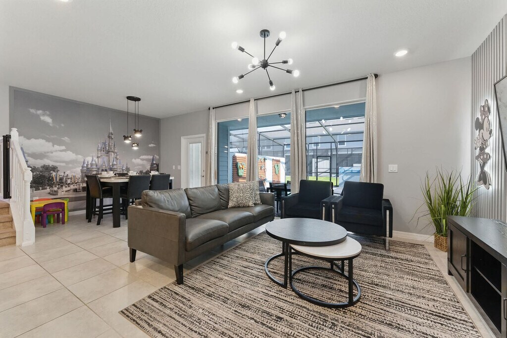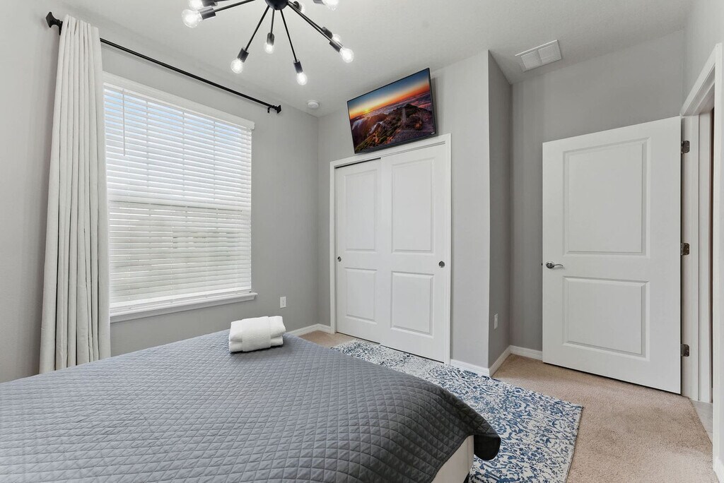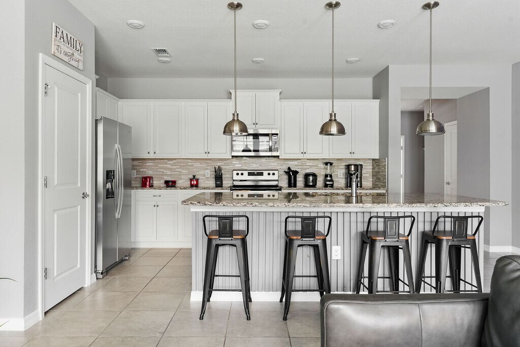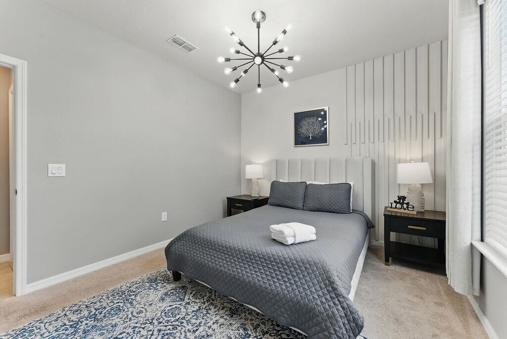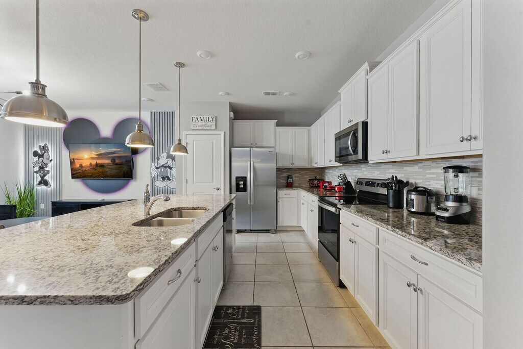 Step into a world of fantasy and fun in this 5-bedroom Windsor Island home, where comfort and entertainment await the whole family. Enjoy a Mickey-themed living room, a Star Wars family room, and bedrooms inspired by Frozen, Mario Bros, and Avengers. With a private pool and full resort amenities, this spacious layout is a perfect escape to create magical memories. Step into a world of magic and imagination in this stunning 5-bedroom vacation home, where every room is a new adventure. From the Mickey-themed living room to the castle-inspired dining area, fantasy fills every corner. Kids and adults alike will love the Frozen, Avengers, and Mario Bros bedrooms, while the upstairs Star Wars family room offers an out-of-this-world movie night experience. The open-plan layout features a fully equipped kitchen and spacious living areas perfect for relaxing after a day of fun. Step outside to your private heatable pool with lounge chairs and a half bathroom nearby, your personal oasis under the Florida sun. On the first floor, enjoy a cozy queen suite with a private bathroom. Upstairs, you'll find a luxurious king master suite, a Frozen bedroom with two single beds, an Avengers room with a bunk bed (double and single), sharing a full bath, and a Mario Bros queen suite. Extras include a laundry room with washer and dryer, free WiFi, complimentary parking, and a starter welcome kit with essential bathroom and kitchen amenities. Pool heating and BBQ grill usage are available for an additional fee. Discover the idyllic haven of Windsor Island Resort, situated in Orlando, Florida, an enchanting haven tailor-made for families seeking relaxation and exploration amidst the world-class theme parks and attractions of Orlando. Escape to the newest gem in the realm of vacation rental resorts, a place that will undoubtedly beckon you back, year after year, with unrivaled resort amenities. The breathtaking clubhouse stands as a centerpiece, boasting a resort-style community pool adorned with dual water slides that cascade with pure exhilaration. Drift lazily along the lazy river, rejuvenate within the hot tub's soothing embrace, and let your little ones revel in the splash pad's gleeful merriment. The 24-hour manned security entrance ensures peace of mind throughout your stay. An inviting firepit area kindles the warmth of camaraderie, while the poolside miniature golf course and the basketball court invite friendly competition. For sports enthusiasts, a soccer field awaits to channel your inner athlete. At the heart of it all, the clubhouse offers an outdoor bar and dining area, promising hours of laughter and relaxation. At Windsor Island Resort, every moment is crafted to infuse your stay with wonder and cherished memories. Quiet hours are between 22:00 and 8:00. [SI]