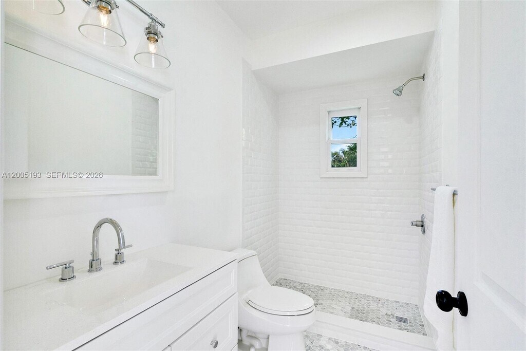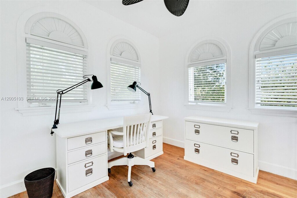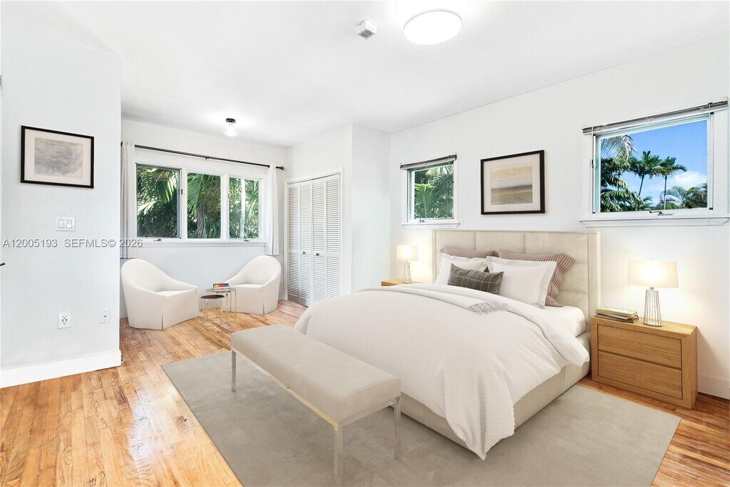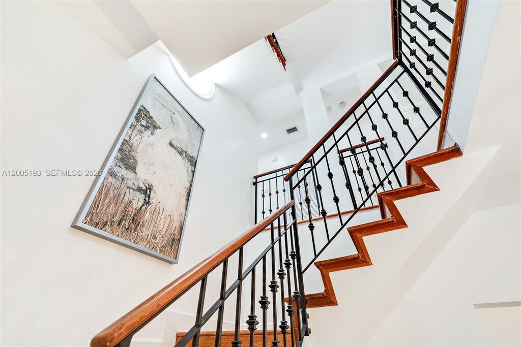 This stunning 3-story, 4-bedroom, 4-bath courtyard villa with a versatile room is located on a premier, quaint street in South Coconut Grove. Behind a walled & gated entrance, enter through exquisite Spanish cedar double doors into a perfectly designed split floor plan filled with an abundance of natural light. French doors open to a pristine lap pool & lush, private grounds with a covered outdoor space, creating seamless indoor & outdoor living. The kitchen features a gas range, with impact windows & doors throughout. The second-floor primary bedroom includes an ensuite bath. A separate private studio apartment offers a full bedroom & bathroom with its own grand exterior staircase. The third-floor tower suite is ideal for a home office or den. MLS # A12005193