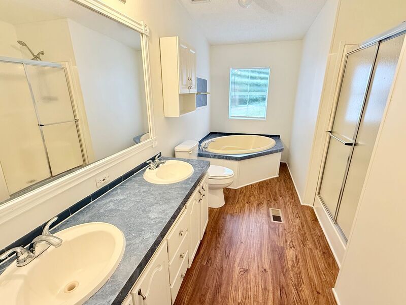 View In 3D: Welcome to this well-maintained, move-in-ready home located in the highly sought-after Dixon, Sims, and Pace school district. With its spacious living areas and open-concept design, this property offers both comfort and functionality. The large, open living area flows directly into the spacious kitchen with an abundance of cabinet and counter space and sliding glass doors leading to the back deck. Kitchen appliances include a side-by side refrigerator, range/oven, dishwasher, and microwave. The primary bedroom boasts cozy carpet, a generous walk-in closet, and an ensuite bath with dual vanities, a walk-in shower, and separate garden tub. Two additional bedrooms share a second full bath with single vanity and tub/shower combo. Additional highlights include an expansive back deck leading out to the large, fully-fenced backyard, a separate two-car garage, a dedicated laundry room with space for a full size washer and dryer, and a covered front porch.