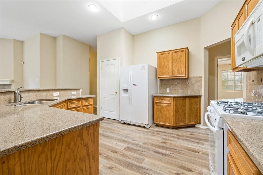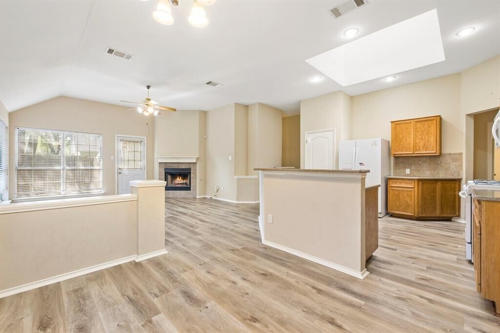 Vacant and ready for May 1st move-in. Spacious 4 bedroom 1 story home in a great neighborhood! The open and flexible floorplan of this home gives you plenty of options to make the space work for you. Easy to maintain laminate flooring through the entire home. High ceilings and numerous windows, including skylight in the kitchen, offers lots of natural light and a very airy feel. Two living rooms to enjoy! The second living room features the gas log fire place and opens directly to the kitchen and dining. Kitchen has a gas stove, oversized island with breakfast bar, and great storage space. The primary bedroom has an attached bathroom and walk in closet, as well as a door leading directly to the backyard. Primary bathroom includes dual vanity sink, garden tub, and separate walk in shower. All bedrooms are well sized with ceiling fans. Backyard has a patio and plenty of green grass space to play. Easy access to 1431, so you can head to Cedar Park or Round Rock for shopping, dining, or entertainment. Apply via RentSpree: . MLS ID 4101712