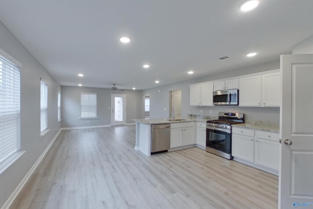 Featuring an open floor plan,this 4-bedroom,2-bath residence offers modern touches like granite countertops,LVP flooring (no carpet!),and recessed lighting. The kitchen includes a gas range,and the home has a gas tankless water heater for efficiency. Natural light fills the space,and outside,enjoy a covered porch,freshly sodded yard,and fully brick exterior. Additional monthly fees include a $29.99 Smart Home Fee,$9.99 Utility Management Fee,and pet fees if applicable. This move-in ready home has it all!