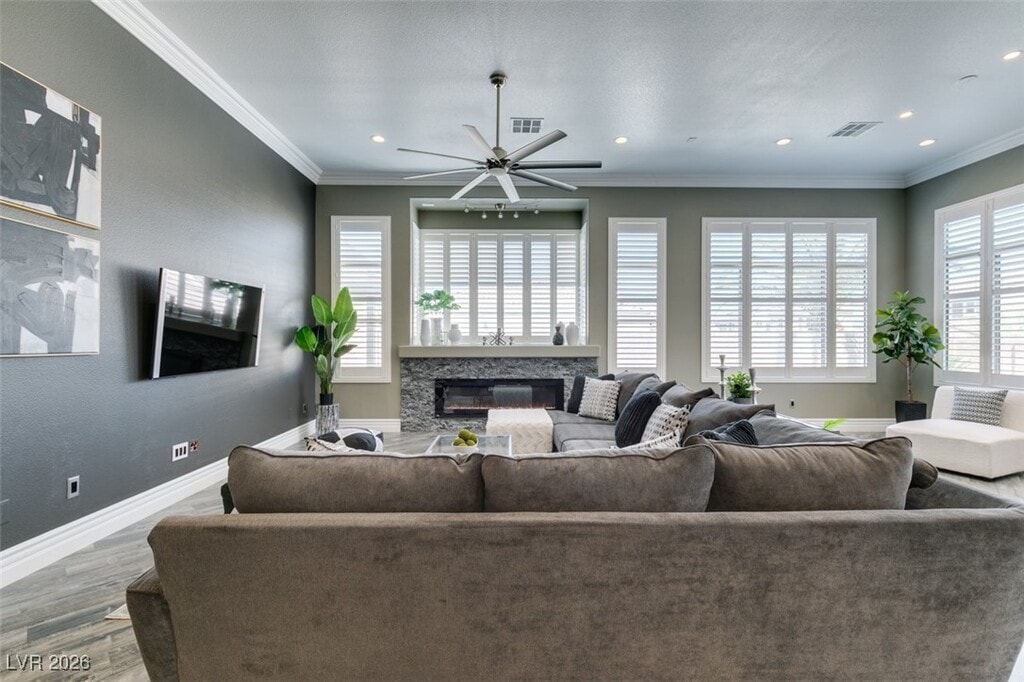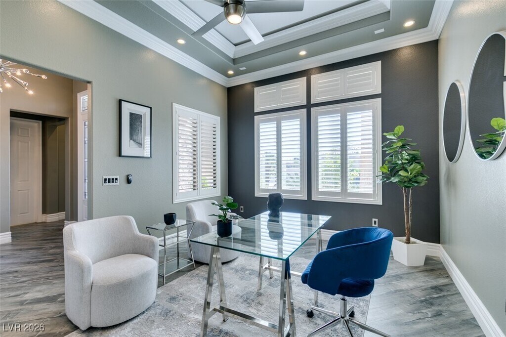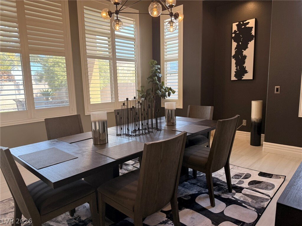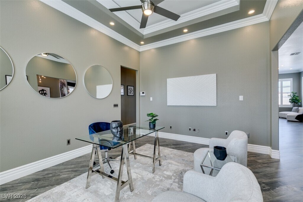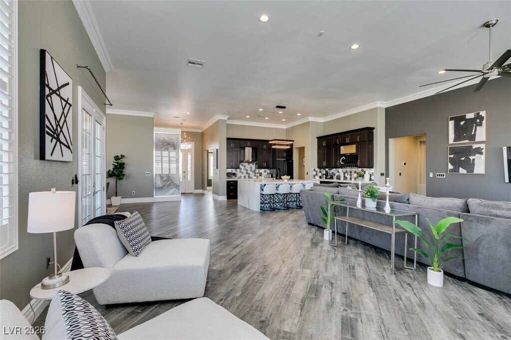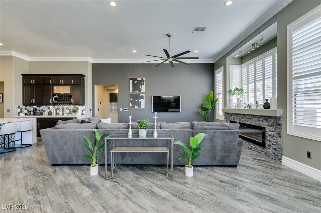 Welcome to Rhodes Ranch - a great place to stay and play! Enjoy the incredible amenities of this guard gated community while living in a beautifully remodeled and professionally decorated single story home. Incredible 12 foot ceilings create luscious space in the great room while windows all around bathe this room in light. A modern kitchen and formal dining room just beyond make the gathering portions of this house just perfect. The primary bedroom, separate from the rest, opens to a bathroom like no other. Two secondary bedrooms and a bright and cheery office complete the picture. The backyard is quiet and private. This home comes completely furnished with a fully equipped kitchen and linens/towels. Also included are HOA dues, yard service and maintenance. $600 NONREFUNDABLE EXIT CLEANING FEE REQUIRED. Rate is for a 12 month lease.