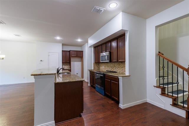 Well-maintained 3-bedroom English-style townhome in a desirable urban location. Recently updated with fresh exterior paint and brand-new dishwasher, electric cooktop, and oven. Features include hand-scraped hardwood floors, granite countertops, and numerous upgrades throughout. Spacious kitchen opens to breakfast area. Split primary suite provides privacy. Located directly across from the community pool. Walkable to restaurants, shopping, and parks with convenient access to major highways and the DFW metroplex.
