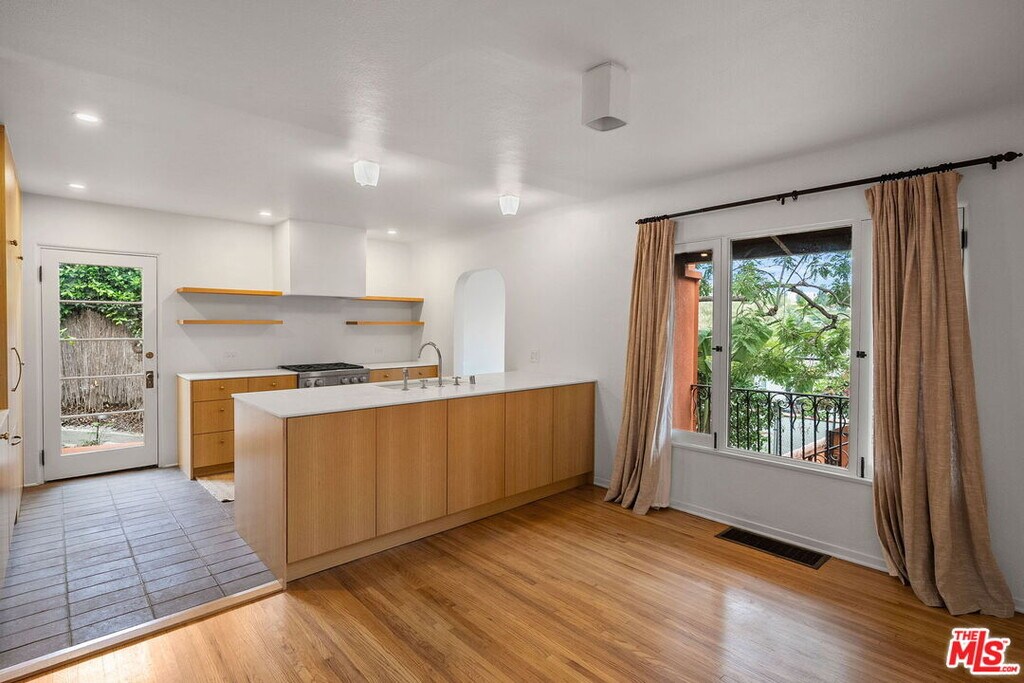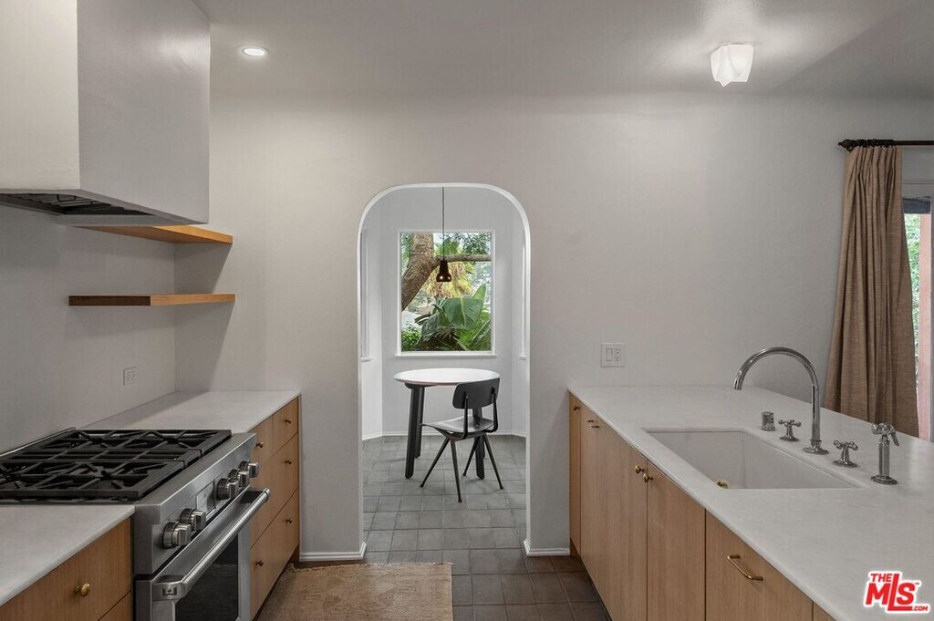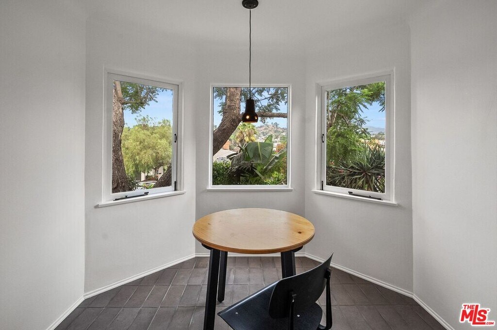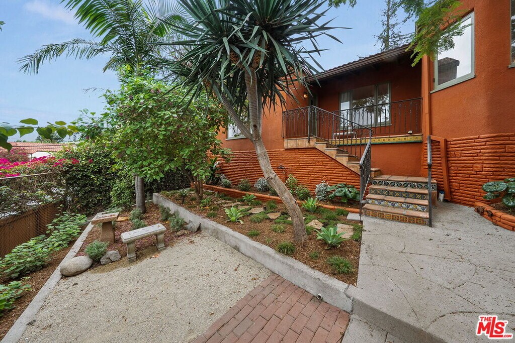 Nestled in the hills of Glassell Park, this Spanish-style home blends vintage charm with modern upgrades and a stunning outdoor sanctuary. From the street, vibrant bougainvillea and tiled Spanish steps create a warm welcome, leading to a landscaped front yard with mature greenery. Inside, the light-filled living room features a large picture window, built-in shelving, and beautifully refinished hardwood floors, with rounded ceilings and graceful archways continuing the home's timeless character. The fully remodeled kitchen is a true highlight, featuring sleek custom cabinetry, stone countertops, designer tile flooring, and open shelving. Integrated paneled appliances create a seamless, elevated look, while a stacked washer & dryer is cleverly concealed behind matching cabinetry for everyday convenience. The adjacent dining room seamless connects to the kitchen and features its own picture window with hillside views, while the octagonal breakfast room provides a truly special spot to enjoy morning coffee or evening sunsets. The bathroom embraces its vintage roots with original tiled walls, a pedestal sink, soaking tub, and arched shower entry, marrying period charm with function. Two spacious bedrooms provide comfort and light-filled retreats. The expansive, terraced backyard is a true oasis designed for relaxation and entertaining. Enjoy multiple seating areas, a fire pit lounge with built-in benches, raised brick planter beds for gardening, and mature fruit trees including avocado, pomegranate, and lime. Just minutes from popular neighborhood favorites like Bub & Grandma's, Dunsmoor, and Capri Club, and easy access to Highland Park, Eagle Rock, DTLA, and major freeways. This home offers hillside tranquility with vibrant city living right at your doorstep. MLS# 25600217