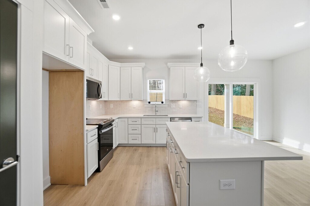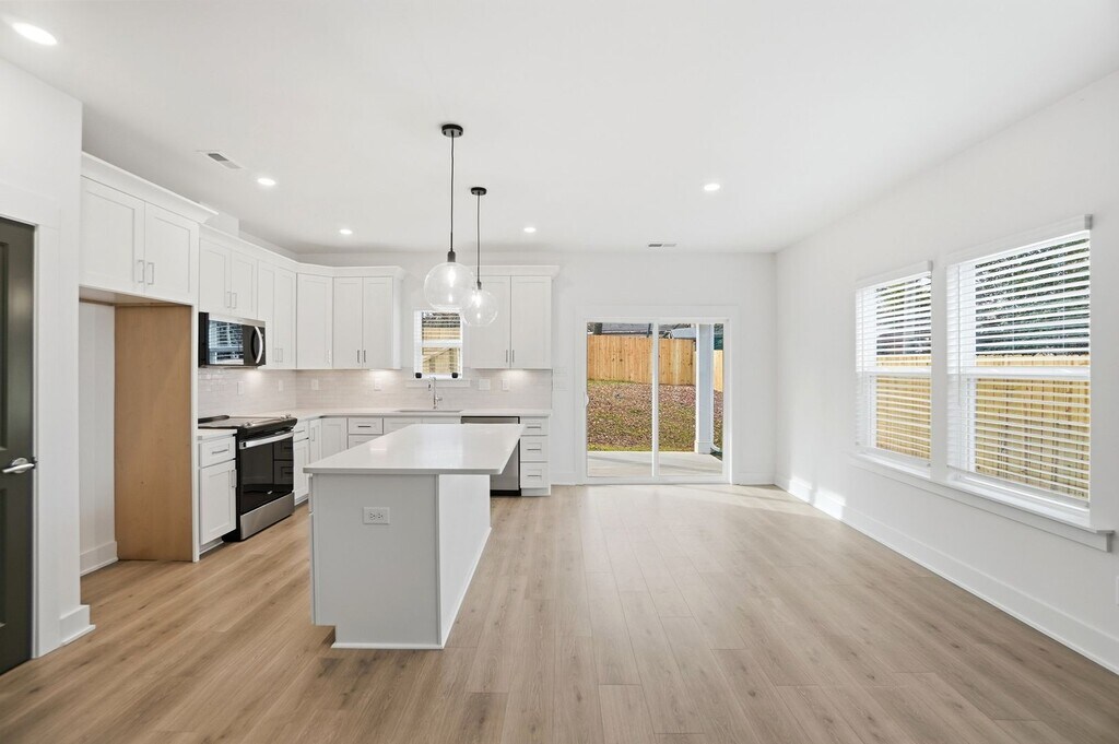 Newly built townhome combines modern design with practical comfort. The open-concept layout is bright and spacious, featuring high-quality finishes and plenty of natural light. The spacious living area showcases stunning vinyl plank flooring, creating a warm and inviting atmosphere ideal for both relaxing and entertaining. The kitchen features sleek quartz countertops, elegant cabinetry, a stylish tile backsplash, a center island, and stainless steel appliances. Every detail has been thoughtfully curated, including upgraded fixtures and finishes throughout. Upstairs, the luxurious primary suite offers a private retreat with a double vanity, walk-in shower, and two expansive walk-in closets. Two generously sized secondary bedrooms and a full bath complete the upper level. You’ll also find a linen closet and a dedicated laundry room for added convenience. Outside to a covered back patio overlooking a spacious, fenced-in backyard, perfect for outdoor dining and entertaining. Pets conditional. $350 pet fee applies.