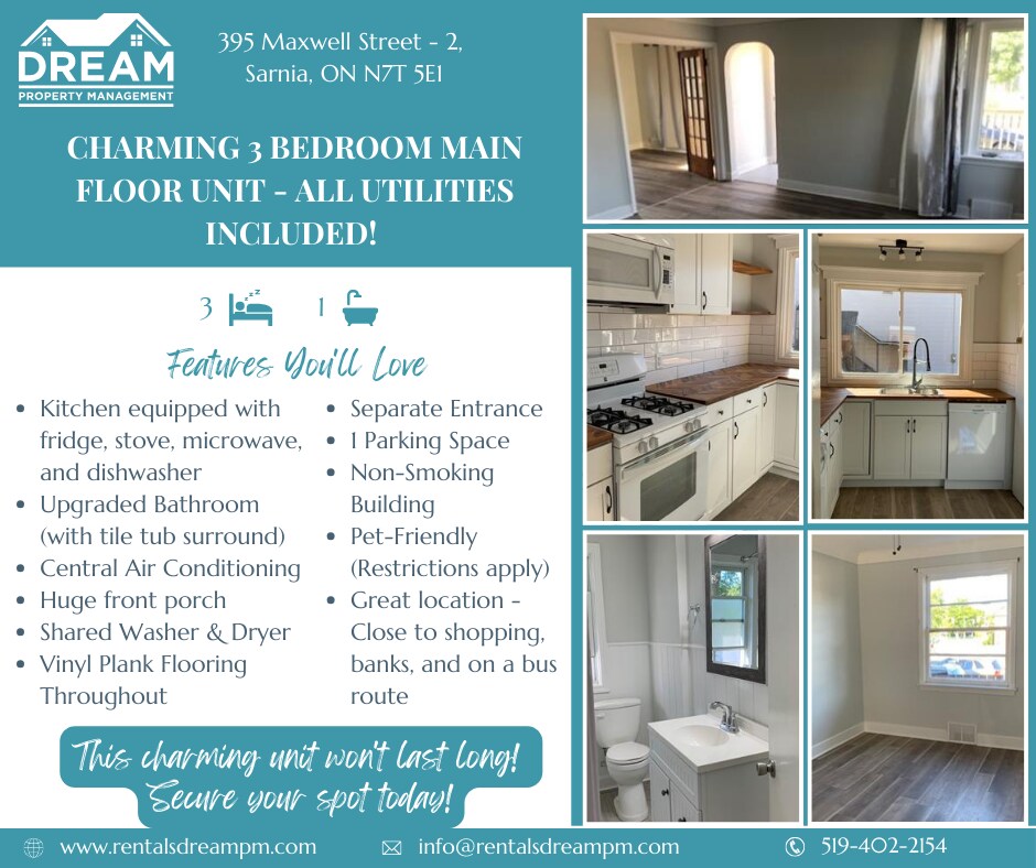Charming 3 Bedroom Main Floor Unit - All Utilities Included! Experience the charm and comfort of this beautiful unit in a peaceful neighborhood. This is the perfect place to call home! Features You'll Love: -Modern Kitchen - Equipped with fridge, stove, over-the-range microwave, and dishwasher -Upgraded Bathroom - Tile tub surround for a clean, modern look -Central Air Conditioning - Comfortable living year-round -Washer & Dryer - Available on designated days in a shared common area -Painted Throughout - Bright and move-in ready -Vinyl Plank Flooring Throughout - Durable, modern, and easy to maintain -Huge front porch - Perfect for entertaining family and friends -Separate Entrance - Added privacy -1 Parking Space Included - Conveniently located in front of the home -Shared Backyard - Common outdoor space -Non-Smoking Building - Clean and fresh environment -Pet-Friendly - Limited Pets Allowed (Restrictions apply) -Prime Location - Close to shopping, banks, and on a bus route Location Highlights: *Schools: -Hanna Memorial Public School (750m) -London Road Public School (800m) -P.E. McGibbon Public School (1.7 km) -Saint Matthew Catholic School (1.8 km) *Healthcare: -Bluewater Health Sarnia (700m) -Lambton Family Dental (700m) -Good Doctors Sarnia (750m) -Sarnia Medical Group (900m) *Shopping & Amenities: -Kyle's NOFRILLS Sarnia (1.8 km) -Downtown Market (1.9 km) -Sarnia Farmer's Market (1.9 km) -Food Basics (1.9 km) -Sarnia Produce (2.2 km) -Real Canadian Superstore Murphy Road (2.6 km) Tenant Requirements: (Only qualified applicants will be contacted!) -Online Application: -First and last month's rent + Key deposit -Credit check & References -Tenant's insurance Don't miss out - Fill out an application today and make this yours! -Email: -Call: -Online Application: Don't miss out - This home won't last long! Reach out to us & Unlock Your Perfect Home with Dream Property Management! *Disclaimer: Distances are approximate based on Google Maps. All information provided is deemed reliable but is not guaranteed and should be independently verified. Please note that all rental agreements must comply with the Residential Tenancies Act of Ontario.