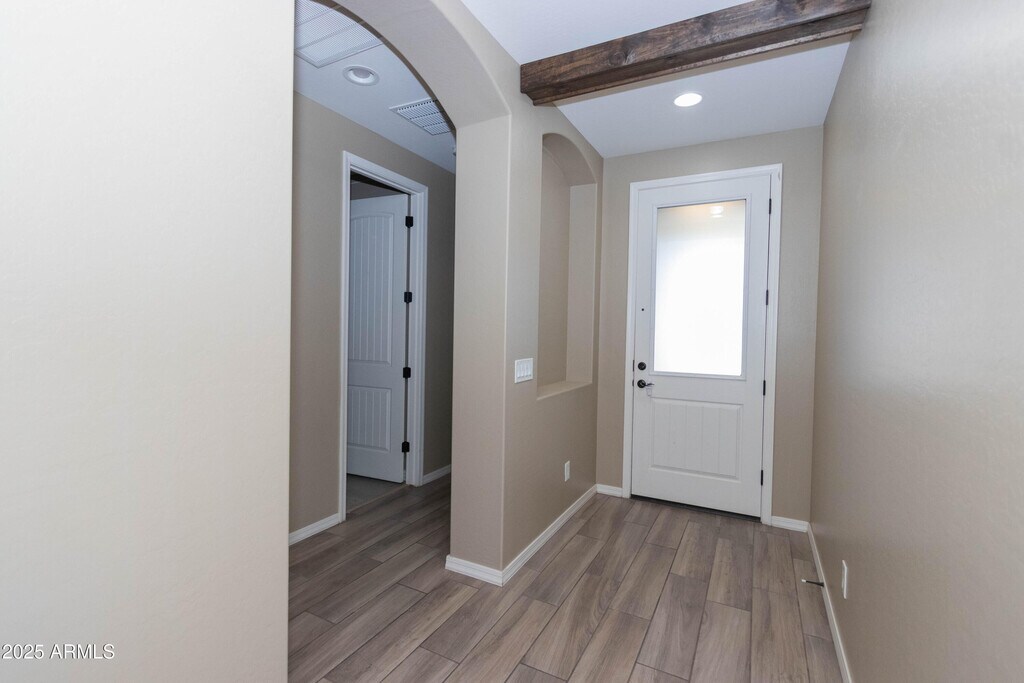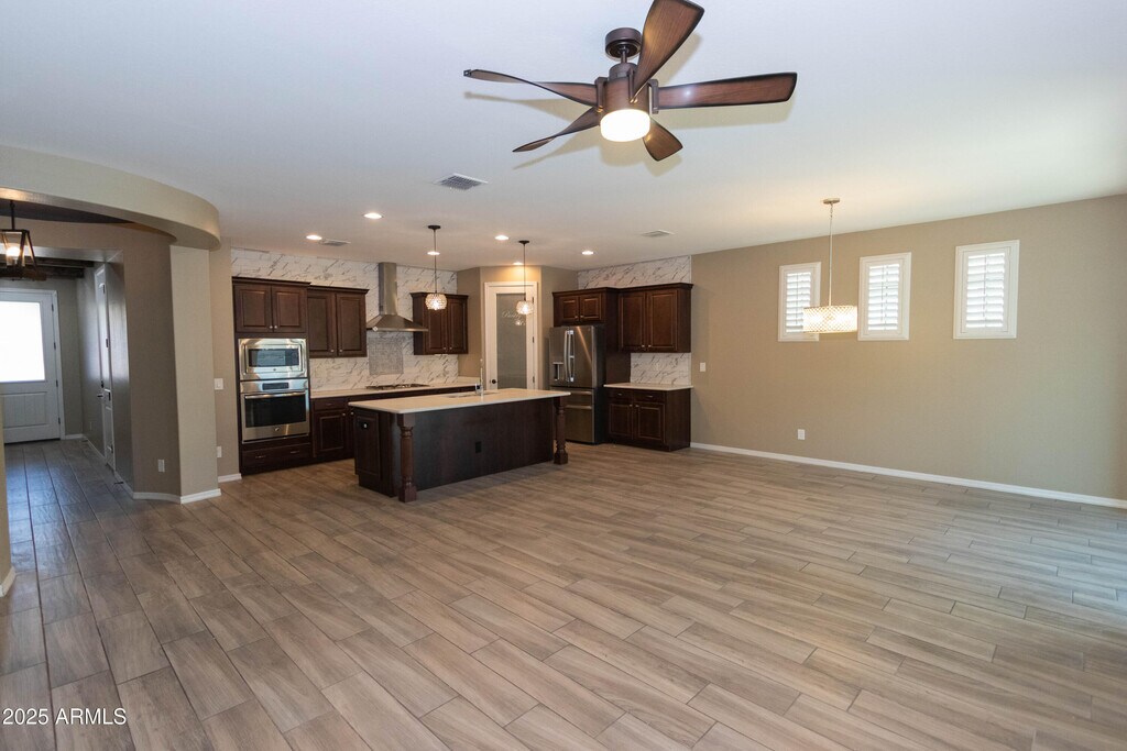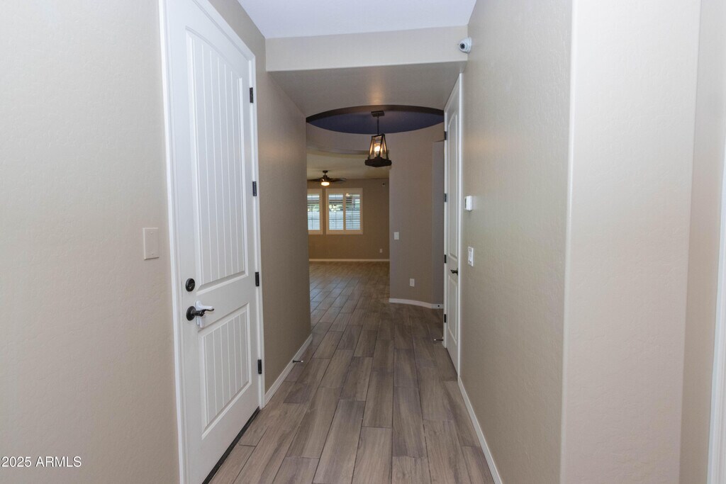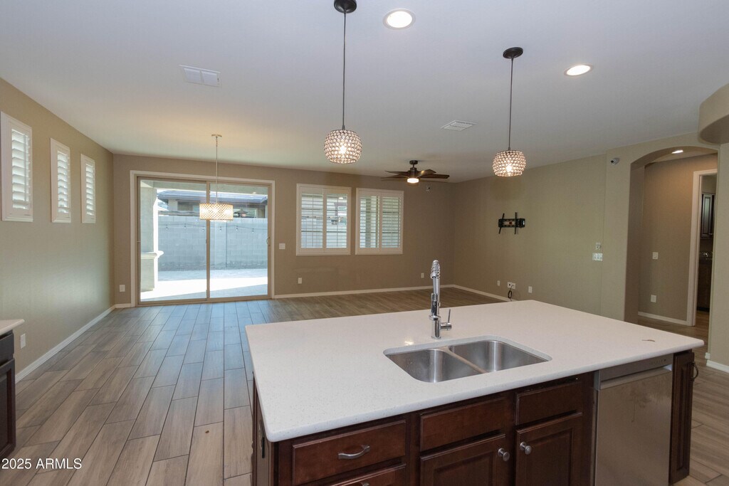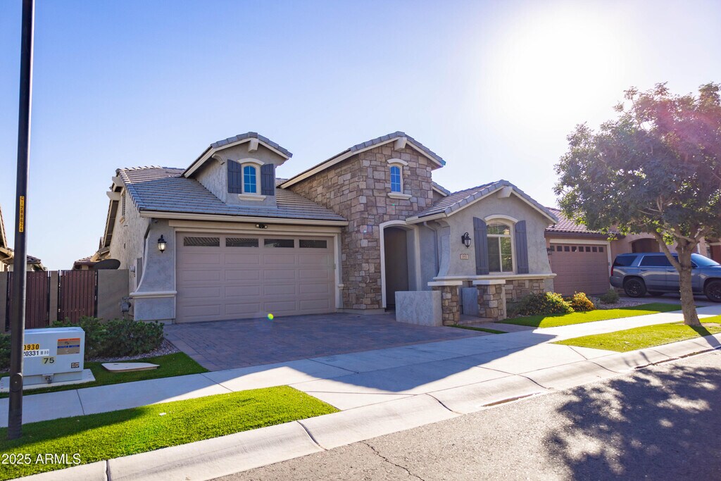 Beautifully upgraded 4-bed,2-bath home in the sought-after Cooley Station community! This modern home features an open floor plan,ceramic wood-look flooring throughout and laminate in the bedrooms,plantation shutters,and a front-entry 2-car garage that offers convenient Lv.2 EV charger,while the low-maintenance backyard features artificial turf and Travertine pavers along both sidesideal for relaxing or entertaining. Cooley Station offers resort-style amenities like a sparkling pool,green spaces,and playgrounds,with easy access to the Loop 202 and Mesa Gateway Airport.