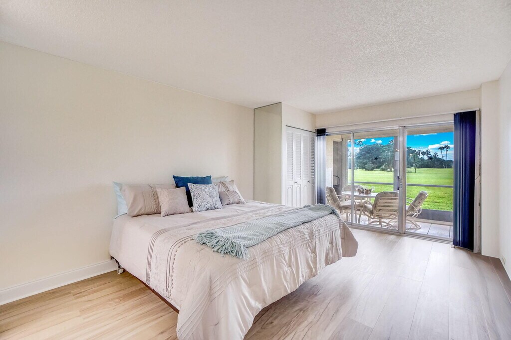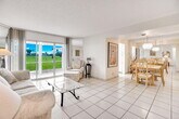 BRIGHT & SPACIOUS FIRST FLOOR, 2 BEDROOM, 2 BATH CONDO beautifully located on the golf course with many amenities offered in this 55+ community. Step outside to the 25-foot enclosed glass and screened Lanai/Patio with beautiful views of the Golf Course and amazing sunsets in the evening. Available for Annual lease ($1950) or Seasonal ($2200) Furniture negotiable. Rent includes water, WI-FI internet/TV service, and use of the Poinciana Place community recreational facilities. The Patio is accessible via sliding glass doors from the Living Room, Kitchen, and Primary Bedroom. Split-bedroom layout offers privacy for both residents and guests. Porcelain tile floors in living areas with new plank flooring in bedrooms. Large eat-in kitchen has plenty of space for cooking and dining.