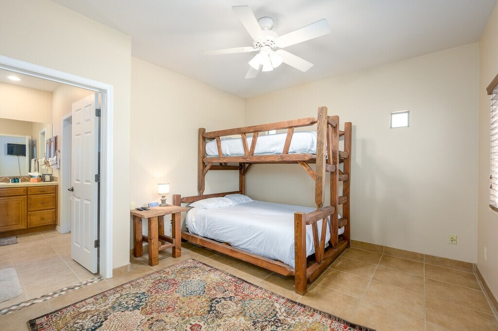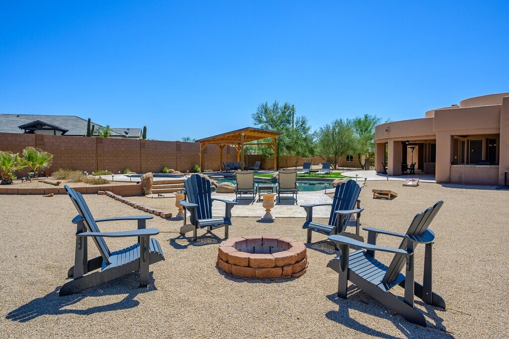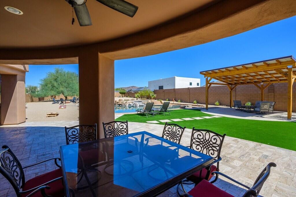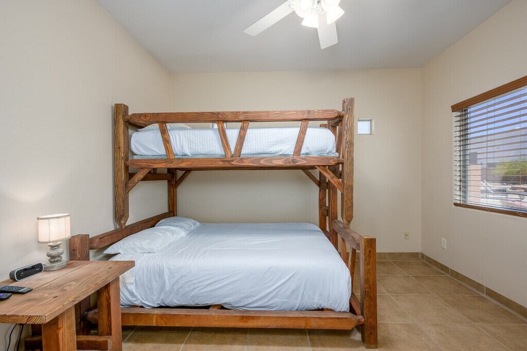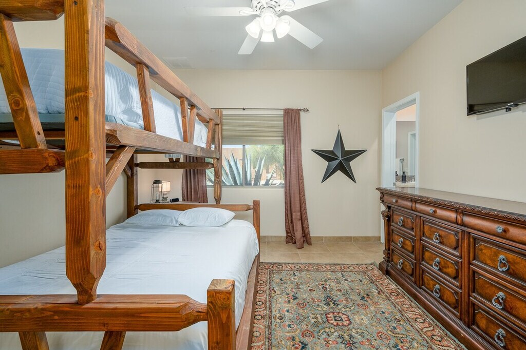 Casa Sonoran is a spectacular home nestled on an oversized lot with plenty of outdoor space. This home offers wonderful curb appeal with refined desert landscape, a spacious 3-car garage, circular driveway, courtyard entry, and RV Gate. The chef's kitchen features granite counters, wood cabinets, tile backsplash, center island, pantry, stainless steel appliances, and patio access. The main suite boasts a full ensuite with a king-size bed, dual sinks, and a walk-in closet. The second and third guest bedrooms offer twin over queen bunk beds. The stunning backyard is a desert oasis ideal for entertaining with a covered paver patio, built-in BBQ, inviting gazebo, sparkling pool, spa with a stone waterfall, and plenty of space to hang out. All linens, bath and pool towels are provided, and free Wi-Fi is available. There is an additional fee to heat the pool and/or spa. It heats off of a propane heater, so you will be responsible for the propane used. Guests will be liable for the exact invoice of refill for propane used for heating the pool and/or spa. Cost depends on the time of year and how warm you heat it. There is a $400/month electric cap in the summer months from June through September. Guests agree to this policy upon booking and are liable for the overages. $400/month normally covers it unless it is abused. No pets are allowed. Guests are liable for any damages caused to the property. [SI]