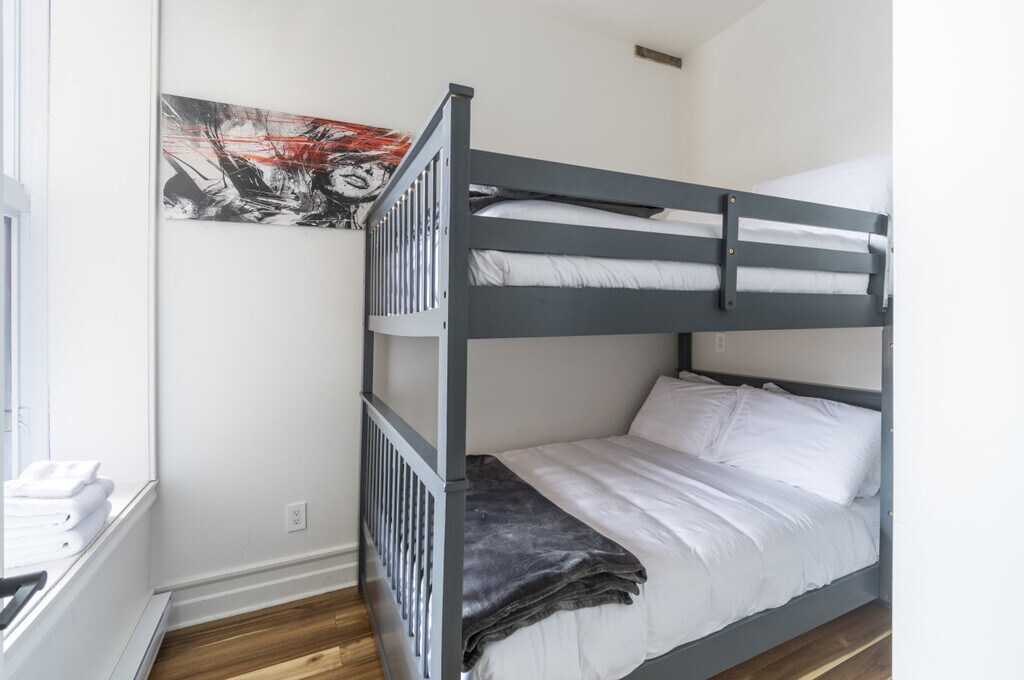 Experience the best of Montreal from this charming and comfortable 3-bedroom, 2-bathroom apartment located in the vibrant Plateau district. Perfect for families, groups, and business travelers, this stylish retreat offers modern comforts and high-end amenities. Enjoy an unbeatable location just steps away from the city's top attractions, restaurants, shops, and public transport. Relax in a sun-filled, open-concept living room with large windows, plush seating, and elegant décor that combines modern luxury with historic charm. Each of the three bedrooms is thoughtfully designed for a restful night’s sleep, featuring two queen beds and a double bunk bed. Cook with ease in a modern kitchen with stainless steel appliances, granite countertops, and all essentials. Enjoy meals together in a stylish dining space large enough to accommodate everyone. The apartment also features two modern bathrooms with high-quality toiletries and fresh towels, and a sunny private balcony perfect for morning coffee or unwinding after a day of exploring. The private terrace and balcony are furnished between May 1st and October 15th. Off-season, the space remains accessible but is not fully set up. Snow removal is provided within 24 hours of storms exceeding 5 cm, and a shovel and salt are available for guest use. Nestled in the heart of Le Plateau-Mont-Royal, one of Montreal’s most vibrant and artistic neighborhoods, you’ll be steps from Lafontaine Park, perfect for picnics, jogging, or scenic walks. The apartment is near Mont-Royal and St-Laurent Streets, home to Montreal’s best cafés, bars, restaurants, and boutiques. You are just minutes from downtown, Old Montreal, and top attractions, with close access to public transportation for easy city access. Self check-in is available with secure keyless entry via a lockbox, with instructions provided 24 hours before arrival. The apartment offers high-speed WiFi and a smart TV for entertainment, as well as laundry facilities with a washer and dryer for your convenience. Guests must be 25 years or older to book. If the number of people exceeds the number registered initially without notice, a fee of $70 per person per day will apply automatically. Make sure to book for the right number of travelers as the number of people will be checked during your stay. Breakage and damage must be reported as soon as possible. Registration Number: 299130 [SI]