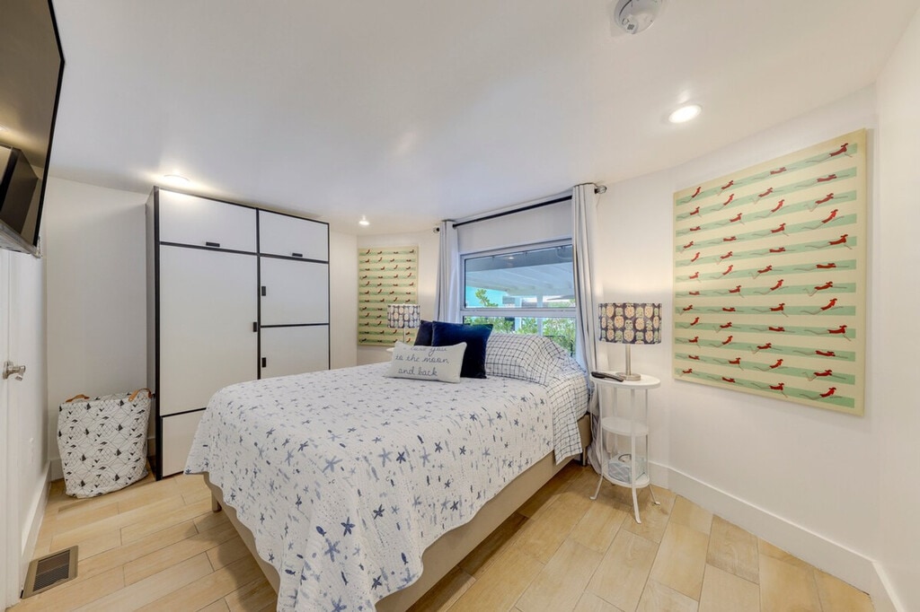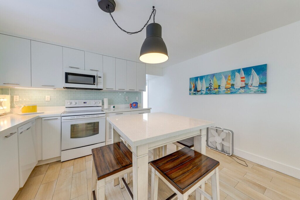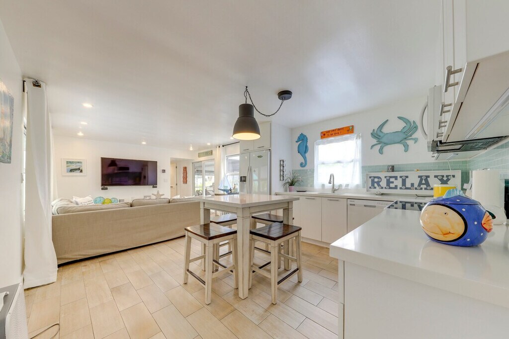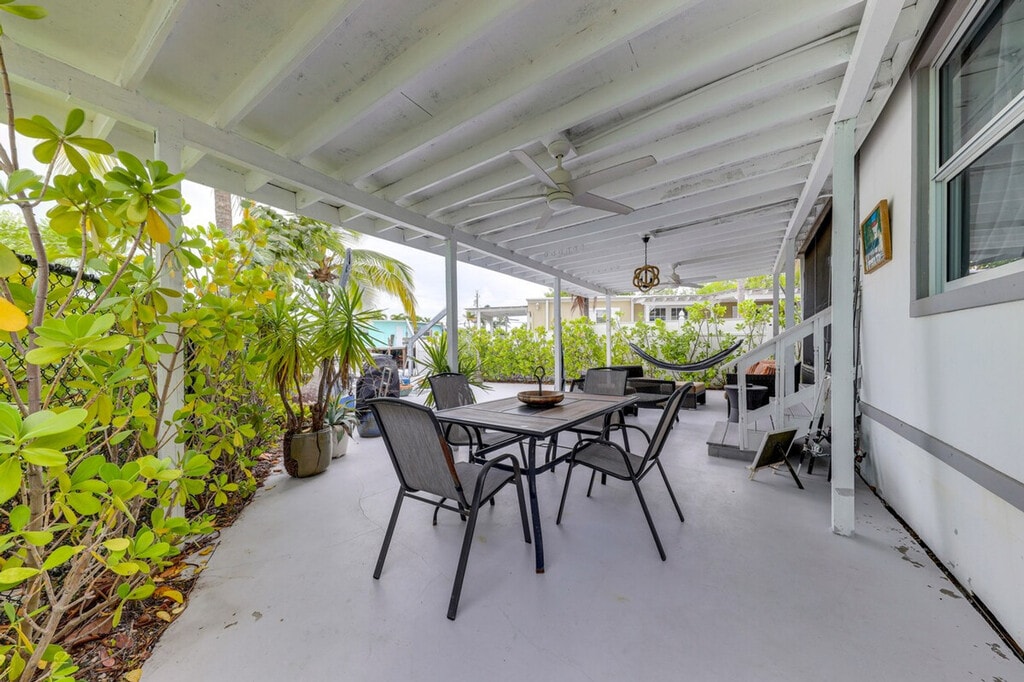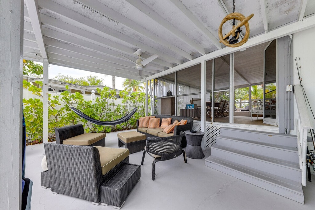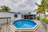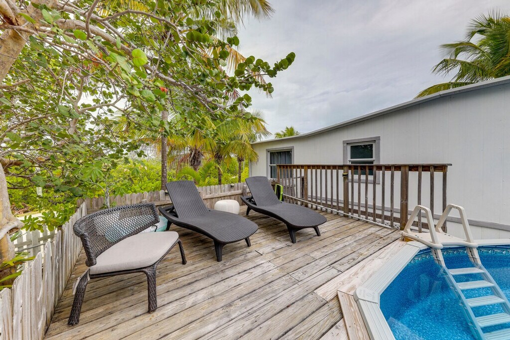 Feel at home in this charming 2-bedroom, 2-bath vacation rental home in Tavernier, FL, just a mile from Harry Harris Beach. This single-story home offers a tranquil escape with steps leading to the entrance and keyless entry for convenience. The apartment features a private outdoor pool, a deck, a lanai with a dining area, two covered patios with lounge seating, a hammock, and ceiling fans. Inside, you'll find three Smart TVs, a sectional sofa, and a 4-person dining table. The fully equipped kitchen includes a stove, oven, refrigerator, dishwasher, microwave, and a drip coffee maker. Linens, towels, a hair dryer, washer/dryer, and laundry essentials are provided for your comfort. Pets are welcome with a $300 fee. Additional accommodations are available next door with a separate nightly rate. Inquire for more information if interested in reserving both rentals. Nestled in Tavernier, this home offers easy access to outdoor adventures. Enjoy a day at the nearby Harry Harris Beach or explore the unique shops at Rain Barrel Village. With free street parking and a driveway for one vehicle, getting around is hassle-free. This property enforces a no-smoking policy and prohibits events, parties, or large gatherings. Guests must be at least 25 years old to book. For your safety, there are three exterior security cameras facing outward, ensuring privacy while monitoring the premises. Additional fees and taxes may apply, and a photo ID may be required upon check-in. [SI]