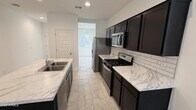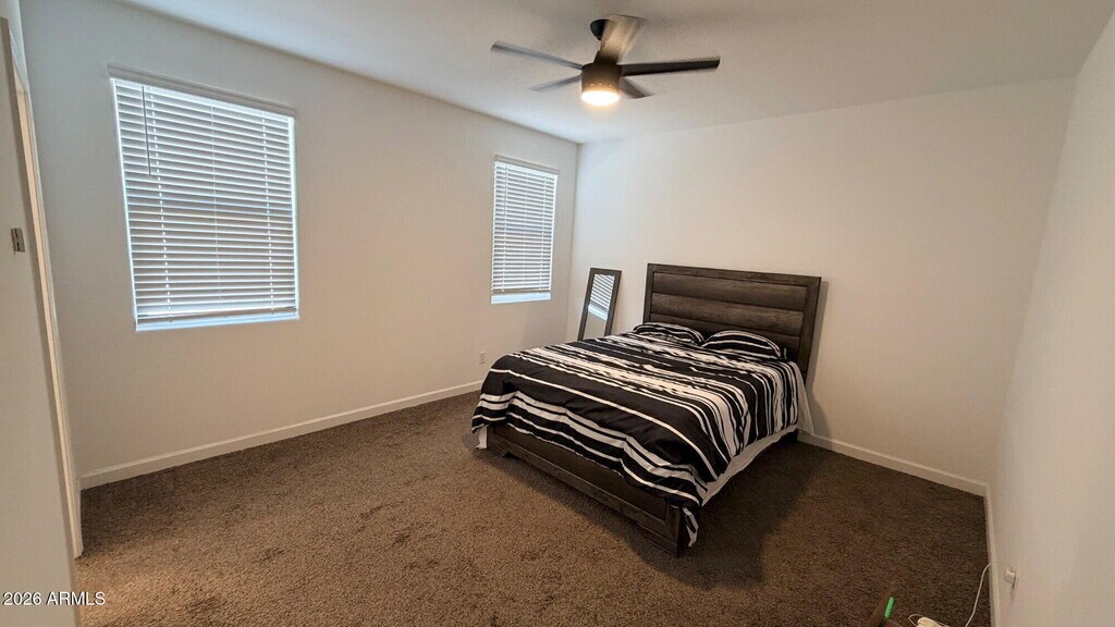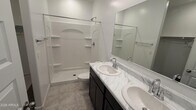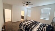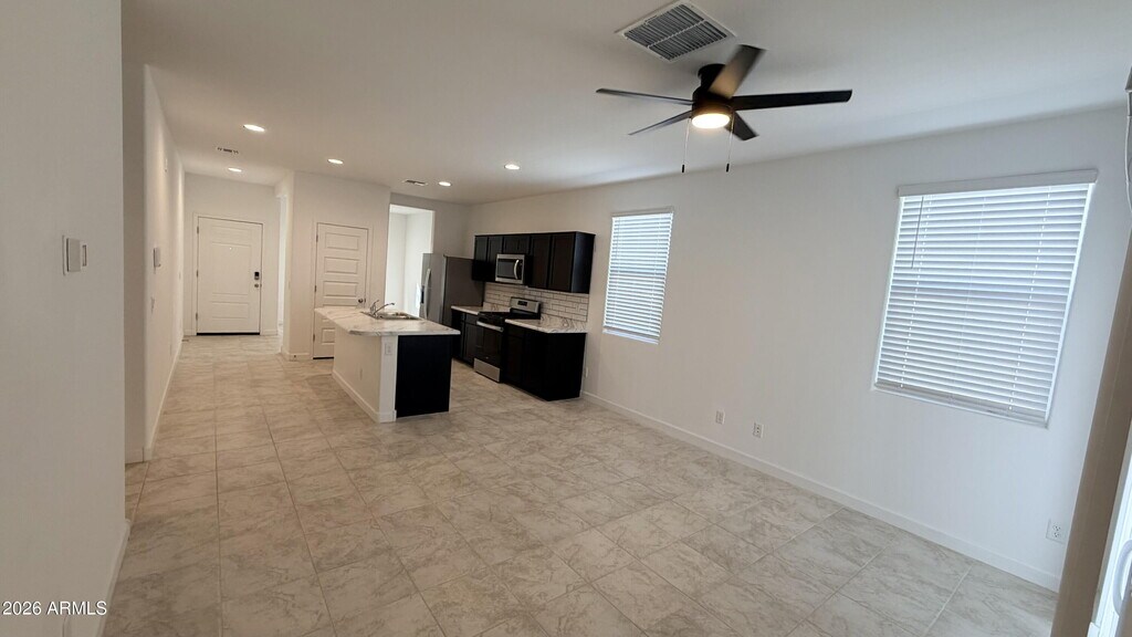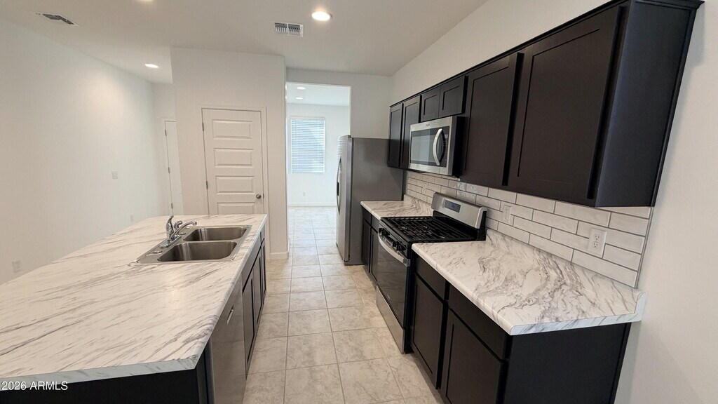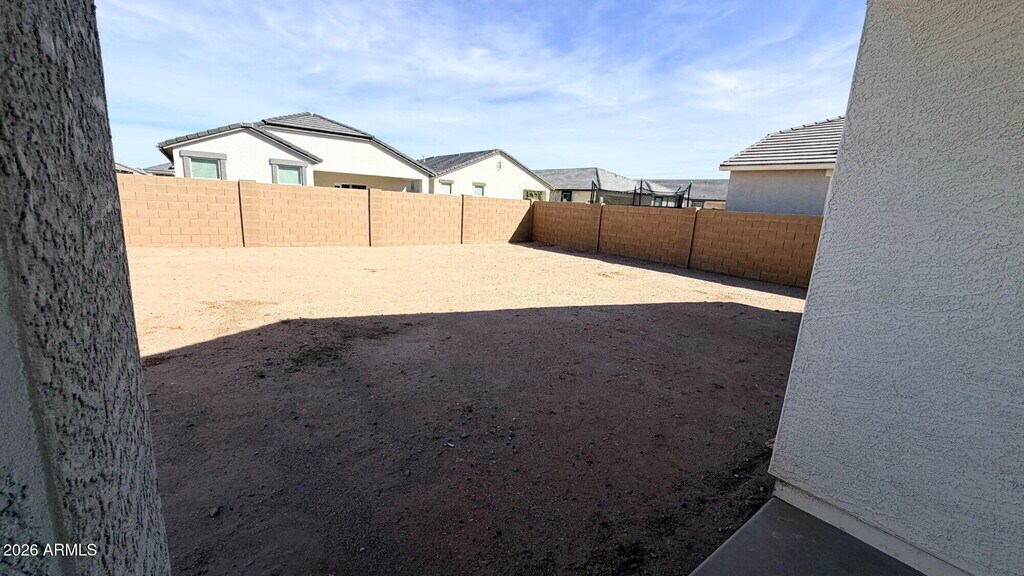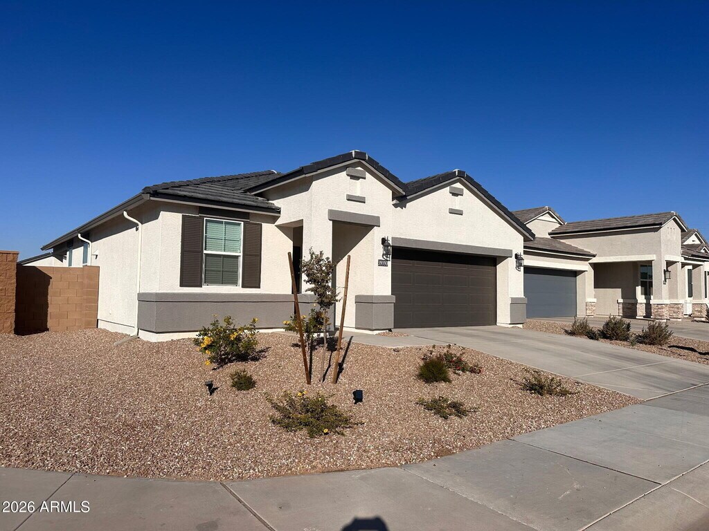 Single level 3 bedroom,2 bathroom home offering 1,924 sq ft in a lake subdivision in Maricopa. Kitchen features island,breakfast bar,gas range,pantry,built in microwave,and dining nook. Main areas include ceramic tile with carpet in bedrooms. Primary suite includes separate tub and shower,double sinks,and walk in closet. 9 foot ceilings enhance the open feel. Washer and dryer included. Fenced backyard with covered patio and irrigation system. Two car garage. Located near Copper Sky Recreation Complex,Pacana Park,and shopping along John Wayne Pkwy.