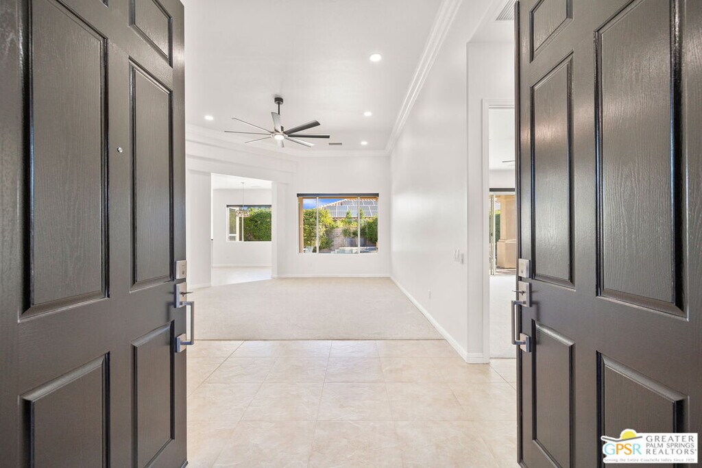 Seeking a responsible long-term tenant to call this exceptional home their own. This beautifully refreshed 4-bedroom, 3.5-bathroom residence offers over 3,063 square feet of bright, open living space, ideal for those ready to settle into relaxed Coachella Valley living, host gatherings with ease, or accommodate multi-generational family needs in unfurnished comfort.Step inside to soaring ceilings and abundant natural light that instantly welcome you home. Elegant living and dining areas flow seamlessly into the gourmet kitchen and include a cozy fireplace with built-in entertainment center. The chef-friendly kitchen boasts sleek black granite counters, crisp white cabinetry, a spacious center island with seating, stainless steel appliances (double ovens and gas cooktop), and generous storage to support your daily routines.The luxurious primary suite provides a peaceful retreat with direct backyard access, a spa-inspired bathroom featuring dual vanities, a soaking tub, a separate shower, and an expansive walk-in closet. Three additional well-appointed guest bedrooms ensure plenty of flexibility, highlighted by a highly desirable attached casita with its own private entrance and full en-suite bath perfect for long-term guests, family members, or a dedicated home office.Practical features include a convenient indoor laundry room with sink and storage, ceiling fans throughout for year-round comfort, durable tile flooring in main living areas, and fully owned solar panels that deliver outstanding energy efficiency and noticeably lower utility bills.Your private backyard oasis completes the package: a sparkling pebble-tec pool with raised spa and cascading waterfall, built-in outdoor BBQ bar ideal for relaxed al fresco meals, covered patio with ceiling fan, lush privacy hedging, low-maintenance landscaping, and stunning mountain views.All this is nestled within the secure, tranquil guard-gated Montecito community, just minutes from world-class golf, El Paseo's renowned shopping and dining, premier hiking and tennis, and the lively scenes of Palm Springs, Rancho Mirage, and La Quinta.This unfurnished home is ready for immediate move-in and available exclusively for a long-term lease (minimum one year). If you are a qualified tenant seeking stability, space, and desert resort-style living, this rare opportunity is for you. Schedule your private tour today! MLS# 26632395PS