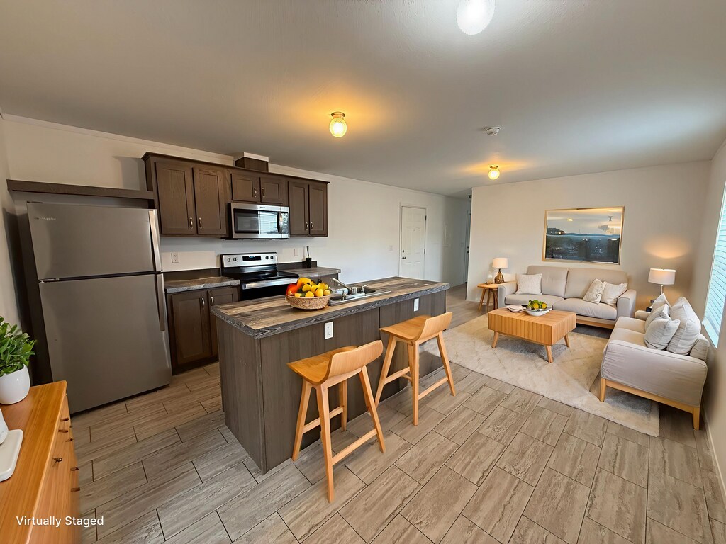 Step into this stunning 3 bedroom, 2 bathroom home located in the heart of Billings! This home offers a perfect blend of modern style, open living, and thoughtful design. The spacious, open concept layout seamlessly connects the kitchen, dining area, and living room, creating an inviting atmosphere. The kitchen features stainless steel appliances, rich cabinetry, and a large island that provides additional workspace and seating. The tile look flooring throughout the home offers durability, elegance, and easy maintenance! The primary bedroom is privately located just off the kitchen and features a generous walk in closet and a private en suite bathroom. The additional bedrooms are placed on the opposite side of the home, creating a desirable split floor plan that enhances privacy. With its modern finishes, bright interior, and move-in ready condition, this home stands out! Schedule your tour today!