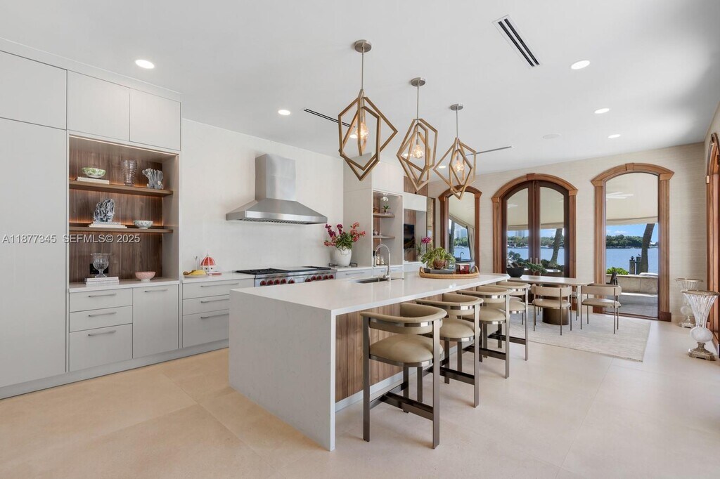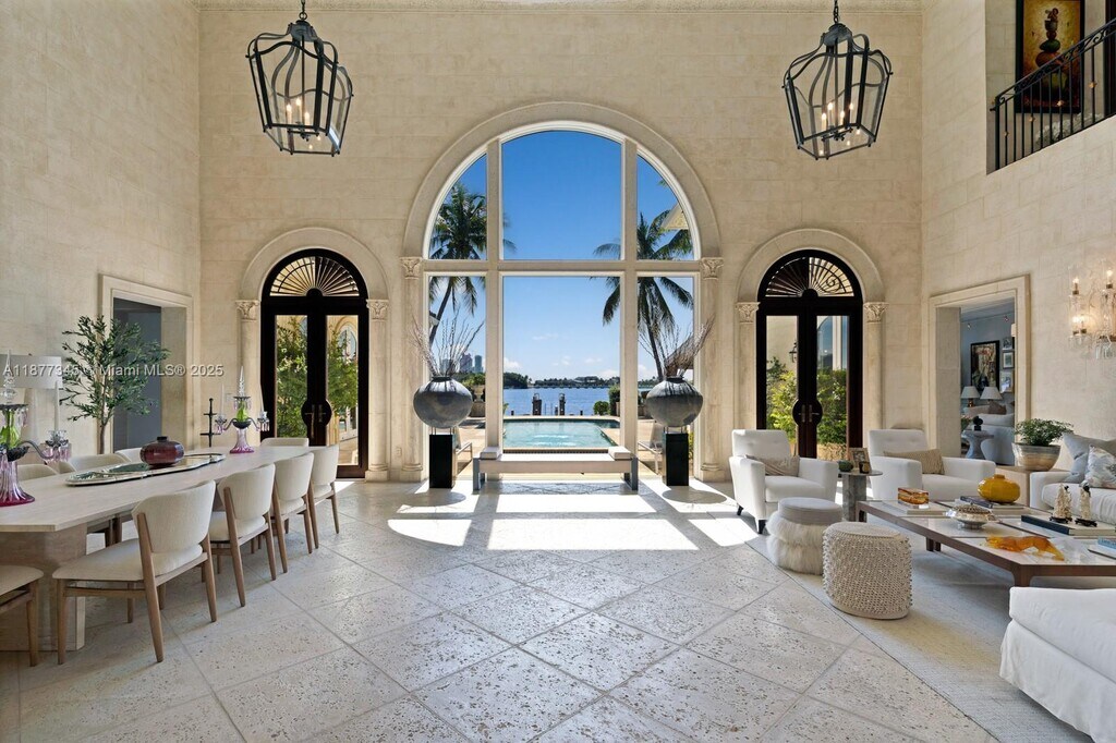 Step Inside With Me! This Mediterranean Revival showcases enchanting interiors, exceptional craftsmanship, and open bay views. The Main House underwent a 2025 renovation featuring double-height ceilings in social areas, sun-drenched living spaces with arched windows, a TV lounge, custom bar, wine cellar, elevator & private office. The contemporary kitchen offers custom millwork, generous island & a breakfast nook. The primary wing exudes elegance with dual dressing rooms, a spa-like bath and panoramic views. A stunning pool + spa, dual cabanas, grill, dock and 115' of water complete the outdoors. A separate ivy-draped guest house and idyllic courtyard entrance set the tone for timeless character with modern comfort. Set on over 17,500 SF of land with gated private driveway & ample carport.