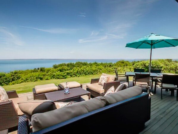 THIS PROPERTY IS A WEEKLY RENTAL PROPERTY!! The 3.3 acre private setting is most picturesque with its positioning in private Upper Makonikey,the long circular driveway,its grassy lawn,and rolling landscape fields . Only a short distance away is over 3,000 feet of PRIVATE sandy association Beaches,directly below,with two nearby parking lot access-ways . Nestled onto this promontory is a crispy white interior 4 bedroom,3 bathroom comfortable home .Set on the highest island point at Upper Makonikey Head in West Tisbury,this property has commanding panoramic views . “ STUNNING”,is the most frequent description of perhaps the best views on the North Shore and possibly the whole island. Also included is a detached Artist's studio . MLS# 73009263