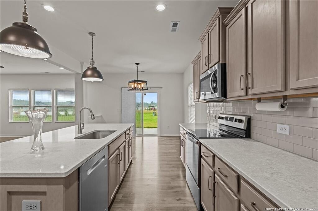 Beautiful, 4 bedroom, 2.5 bath home in Lillington. Open floor plan with LVP flooring downstairs. Large living room area leading into the Kitchen with Quartz countertops, stainless steel appliances, beautiful butler's pantry, Kitchen Island with sink, Eat in Kitchen area. Mudroom with drop off bench and half bath off of Kitchen. Office or flex space too. All bedrooms are upstairs and have carpet. Primary bedroom with ceiling fan, walk-in closet, dual vanities in primary bath with tub and walk in shower. Other bedrooms upstairs share a bathroom with dual vanities and shower/tub combo. Laundry room upstairs too! Large backyard, with extra concrete for all your entertaining needs. Double car garage. **REQUIRED LIMITED LIABILITY PROTECTION POLICY ADDITIONAL $15 PER MONTH**