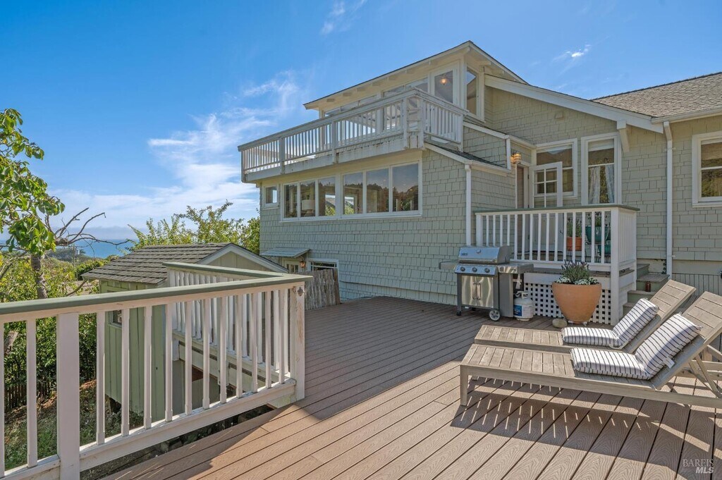 This sunlit Stinson Beach retreat is a rare find. The 3-bedroom, 2-bath main house and 1-bedroom, 1-bath guest cottage sit quietly on the coveted hillside, just minutes from the town and the Pacific. Designed in the style of a New England Cape, the home blends classic charm with modern touches. A stone fireplace anchors the living space, while the kitchen's breakfast bar and reading nook invite relaxed mornings. Decks, porches, and balconies frame sweeping views of ocean and hillsides. Bordering national park land, the property offers direct access to hiking trails and endless outdoor adventures. Every space feels calm, welcoming, and perfectly in tune with the natural beauty of the surroundings truly a uniquely special coastal escape. MLS#325099120