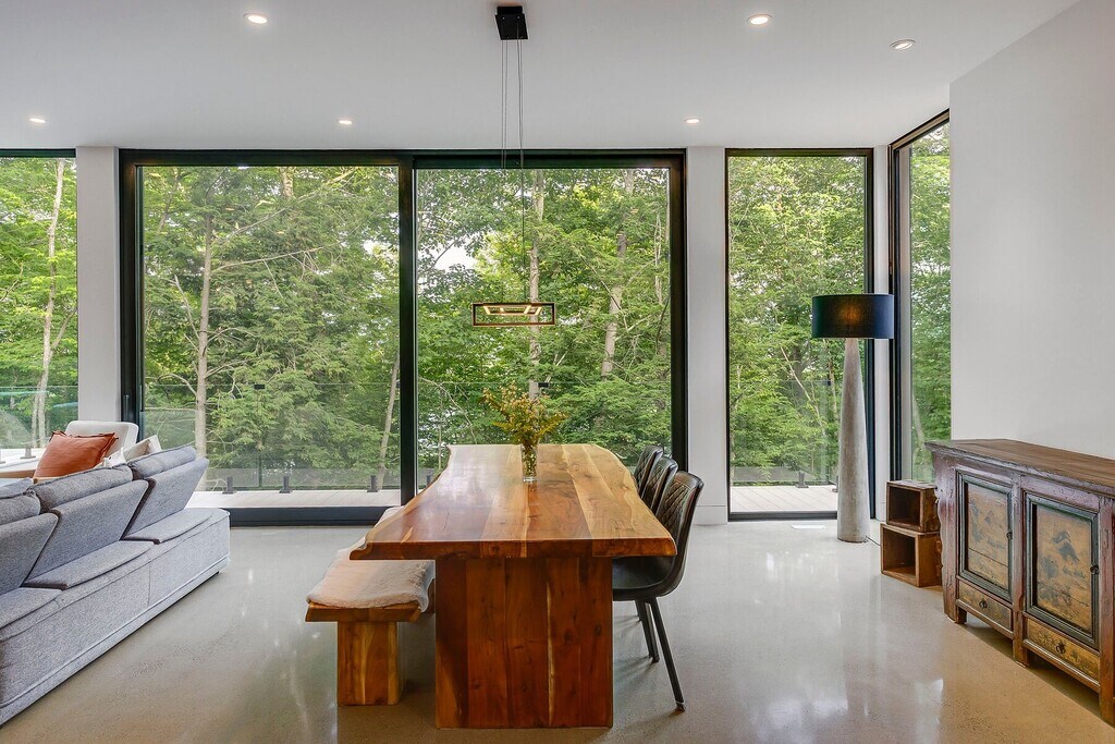 Stunning modern home nestled in nature! Perched at the top of Mount Aki, this exceptional residence, designed by renowned architects MUUK, combines noble materials and timeless style to create a true haven of peace. Expansive windows flood the interior with natural light and offer breathtaking views of a private forest domain spanning over 25 acres. Heated concrete radiant floors run throughout the entire living space. Enjoy the tranquility of the mountain while staying close to all amenities. This property offers an exceptional lifestyle just minutes from ski slopes, hiking trails, and the village!