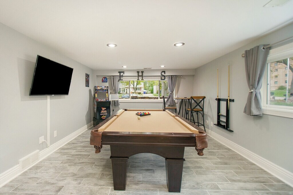Feel at home in this renovated 1700 sq ft unit, located 21 minutes from downtown Naperville. This home features 3 bedrooms and 2 bathrooms. This updated home, renovated in 2020, features updated carpet and flooring. The kitchen is fully equipped with plenty of utensils, including cooking spices and oils. Entertainment options include 5 LCD televisions with access to Hulu, Disney, and ESPN streaming services (English and Spanish), Netflix and Prime Video access (your login), 50+ board games, playing cards, a pool table, and an arcade cabinet with 2000+ games. A spacious, fenced backyard and a 2-car garage with a 50-foot driveway are available. Children-friendly amenities include a pack and play sleeper, a stroller, a high chair, and a booster seat. Downtown Naperville is like a bustling mini-Chicago, including a beach and plenty of bars and restaurants. If the home has a fireplace, it is not for guest use. Up to 300 MBPS internet speed is available, with Wi-Fi throughout the entire home and an ethernet hard line available. The living area has a 55" TV and a sound bar, while the bedrooms have 40" TVs. [SI]