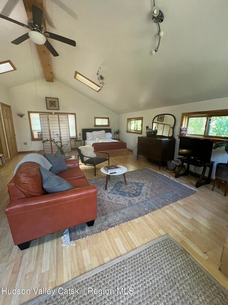 Private studio with mountain views and stunning sunsets in the heart of Woodstock! Studio is well insulated and energy efficient. Fully furnished with all the necessities. Serene mountain escape. Generator back up. Walk up the stairs to a magnificent open studio space with breathtaking mountain views. Skylights and ample windows make for artistic lighting throughout,full sized fridge and dishwasher. Exposed beams,ceiling fans,and private deck for enjoying sunrises and sunsets. Outdoor yard and dining area. Studio looks out onto Mead's Mountain. An inspiring retreat,let this cottage be your muse! Relish living in the forest and watching the seasons change in your private retreat perched above it all. Watch the mountain change thru your windows from the vibrant summer,colorful fall,majestic winter,to verdant spring! Centrally located,minutes to Woodstock town center,15 minutes to Kingston. Scenic walks and hiking right outside the door,wildlife surrounds you. Large Studio,above dwelling garage,steps required. MLS ID 20261800