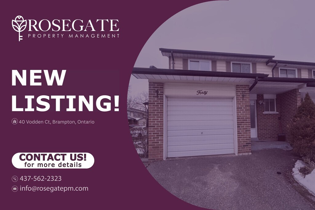 Spacious 3-Bedroom Condo Townhouse with Garage, Backyard & Internet Included – Brampton Welcome to 40 Vodden Court, Brampton — a well-maintained 3-level condo townhouse offering approximately 1,300 sq. ft. of comfortable living space.This home features 3 bedrooms and 1.5 bathrooms, making it ideal for families or professionals seeking a spacious and functional rental in a convenient Brampton neighbourhood.The bright layout spans three floors, providing excellent separation between living and private spaces. The kitchen is equipped with stainless steel appliances, including a microwave and dishwasher, offering both style and practicality for everyday living.Additional highlights include in-unit washer and dryer, central heating and air conditioning, and internet included, helping simplify monthly expenses.Enjoy outdoor living with access to a private backyard, perfect for relaxing or spending time outdoors.Parking is convenient with two parking spaces, including a full driveway and private garage.Located close to parks, shopping, schools, and transit, this professionally managed home offers comfort, space, and convenience in Brampton.Book your viewing today.