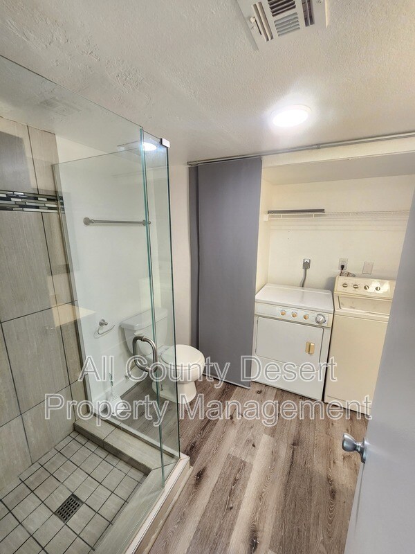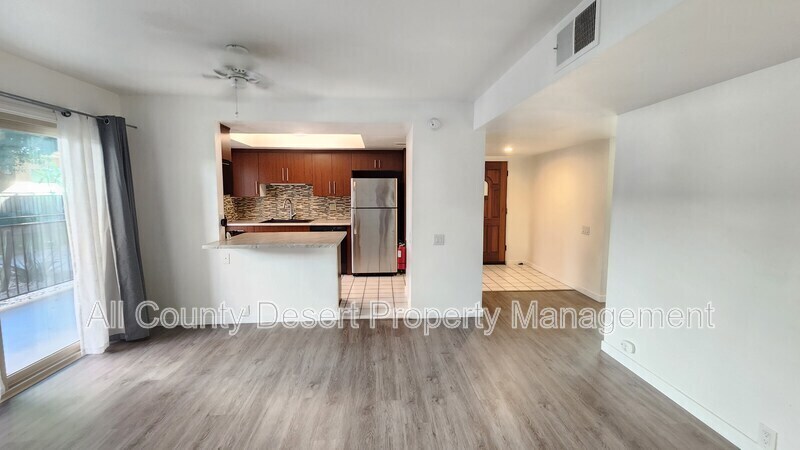 Welcome to Americana Gardens! This inviting ground floor condo features a freshly updated living space. The spacious open-concept living area features sleek grey wood-look flooring, ceiling fan, and large sliding glass doors that flood the room with natural light. The adjacent modern kitchen is stylishly appointed with rich dark wood cabinetry, a striking multi-colored mosaic tile backsplash, and stone-look countertops with a convenient breakfast bar peninsula. It is equipped with a stainless steel refrigerator and contrasting black appliances, including a gas range, dishwasher, and a modern black sink with a high-arc faucet. The bathroom is updated with a dark wood vanity, contemporary lighting, and a bathtub/shower combination featuring custom vertical tile work with a decorative mosaic accent strip. A dedicated laundry area includes a side-by-side washer and dryer for your convenience. Step out through the sliding glass doors in the living room to enjoy your expansive private covered patio. The exterior features manicured desert landscaping with agave and cactus along the walkways, leading to a shimmering community swimming pool and a soothing hot tub spa, offering the perfect space for relaxation. HOA Fees, Gas and Water are all included in the rent. Resident to pay utilities. All applicants must pass a comprehensive background screening including income verification and landlord references. Renter's insurance is required. All applicants must have the following: monthly income of at least 3 times the monthly rent, a good rental history, and an acceptable credit score. If you see this home advertised online for less than the rental amount quoted here, the ad is a SCAM. We are the only authorized agent for this property. Please email us a link to any bogus or fraudulent ads so we can report it to the appropriate authorities. Please do NOT send money to anyone who offers keys in exchange for a deposit check - especially if they are out of state. When in doubt, please feel free to contact us.