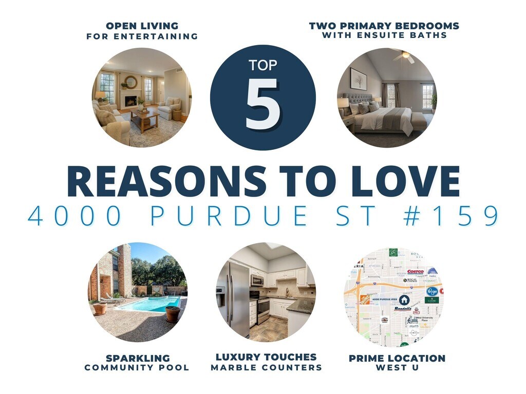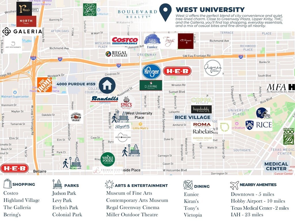 Come home to a flowing floor plan and courtyard style patio,and the community pool that is just steps away. Two primary suites upstairs with walk -in closets and baths en-suite. Even a skylit nook that is perfect for studying,playing,or setting up an office. No flooding,freshly painted,and impeccably maintained by a local landlord. Carport for 2 vehicles right by the door. Full sized washer & dryer in house. Stainless steel appliances in the kitchen. Light wood floors in the living and dining room. This home is move-in ready. Down the street from Greenway Plaza,and an easy drive to Uptown,Downtown or the Texas Medical Center. This West U condo offers the ideal blend of city convenience and neighborhood charm,set among tranquil tree-lined streets. Everyday errands are easy with Central Market,H-E-B,Costco,and local favorite Bering’s nearby. Dining options abound—from neighborhood staples like Buffalo Grill and Torchy’s to fine dining at Eunice,Tony’s,and Kiran’s. MLS# 66010454