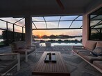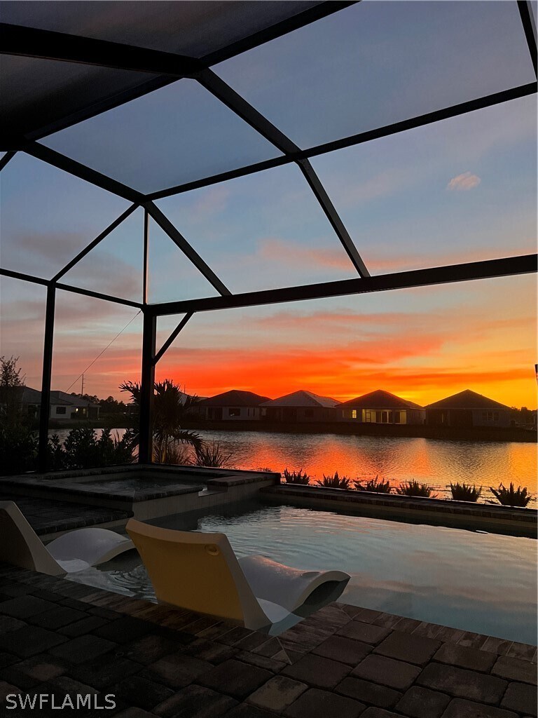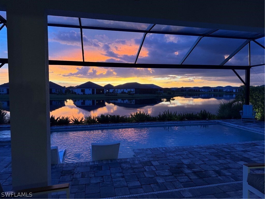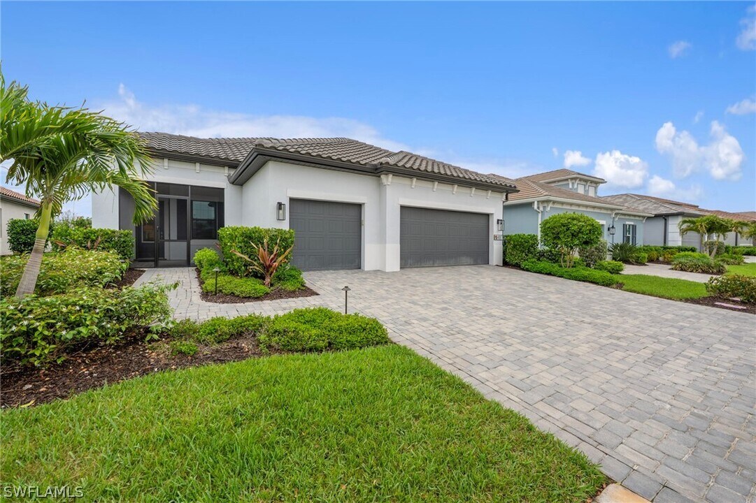 Welcome to Skysail—your resort-style lakefront retreat with wide-water views. This upgraded Sea Mist model in the COVE home area,Lot lines are wider,offers 3 bedrooms + a den with glass French doors,2.5 baths,and an open great room plan with coffered ceilings. Coastal exterior elevation with impact-resistant windows/doors for storm-ready peace of mind. Bright,modern interior with light wood-look plank tile and carpet in the bedrooms,designer finishes,and recessed lighting. Gourmet kitchen features quartz counters,large island,walk-in pantry,42” cabinetry,GE Café appliances,gas cooktop (Gas Neighborhood),Subway Tile backsplash with ornate range vent to outside. Private screened lanai,With No-Seeum screen and Picture box Cage,overlooks one of the prettiest Lake views with a stunning Pool/spa with a Fast and Efficient gas heater. One of the nicest lake views in the community,ideal for coffee and sunsets. This Smart-home has a tremendous outdoor kitchen area under covered Lanai. Home also boasts hardwired alarm. Cat6 wiring throughout for fast streaming and easy TV hookups. Spa-like primary suite and a full-glass shower with custom tile; Bedrooms 2 and 3 are spacious as well with excellent closet space. 3-car garage with extra storage racks installed. Amenities include a lakefront clubhouse,unfurnished!