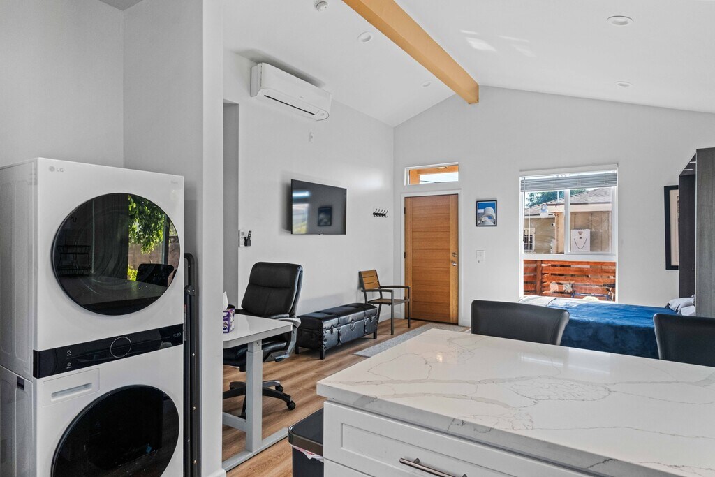 Beautiful, bright, newly constructed fully detached ADU/guest house in pristine, move-in ready condition. Designed with an open-concept layout, this home features soaring pitched ceilings that create a spacious, airy feel throughout. The brand-new kitchen is equipped with built-in appliances and includes an in-unit washer and dryer for ultimate convenience. Enjoy modern comforts such as recessed lighting, dual-pane windows, and air conditioning. The stylish bathroom offers a full-size, glass-enclosed walk-in shower. Step outside to your own private outdoor space—perfect for relaxing or entertaining. Ideally located in the desirable View Heights neighborhood of Los Angeles, just minutes from Kenneth Hahn Regional Park and close to shopping, 24 Hour Fitness, and Downtown Culver City. This one is truly a gem! Rent includes all utilities.