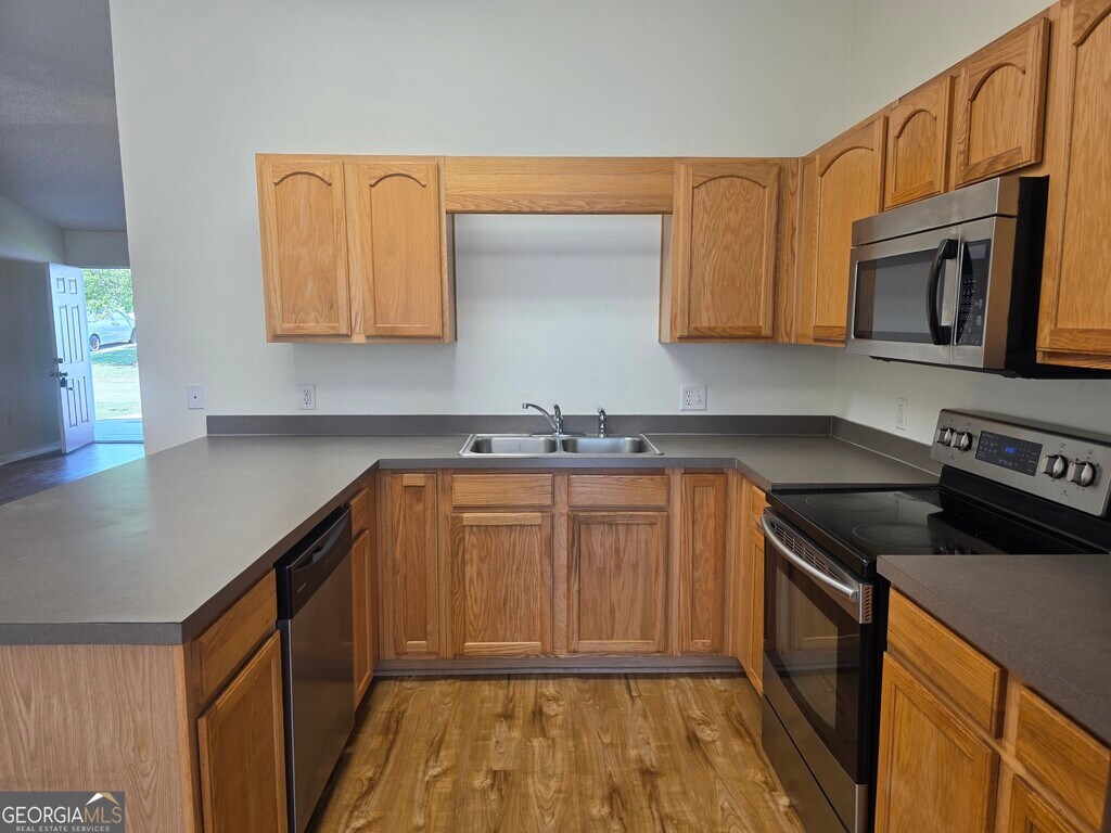 End unit townhome! 3 bedrooms, 2 full baths. Large living room with vaulted ceilings that opens up to kitchen. Kitchen is equipped with all appliances, plus pantry space. Wood vinyl flooring throughout. Laundry room space off of hallway with washer/dryer hookups. Master bedroom with walk in closet. Single vanity, tub/shower combo in master bathroom. Back patio opens up to common area. NO PETS! MLS ID 10733307