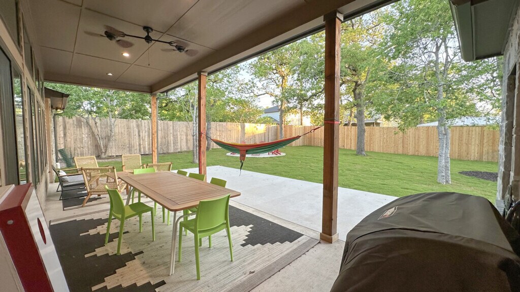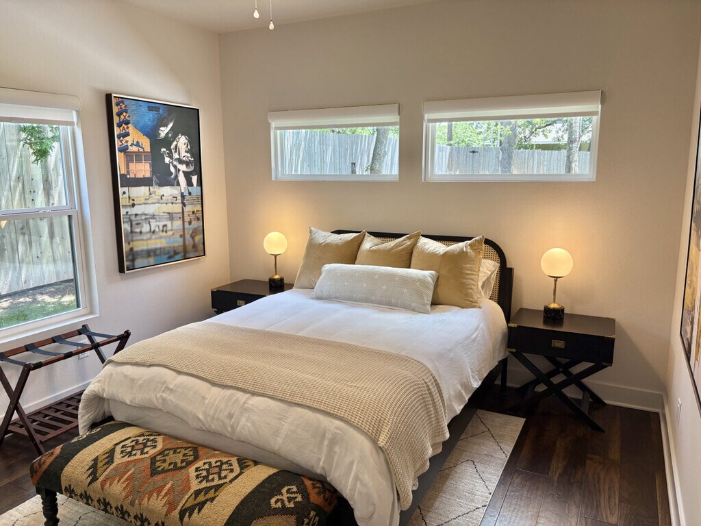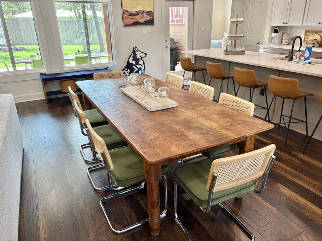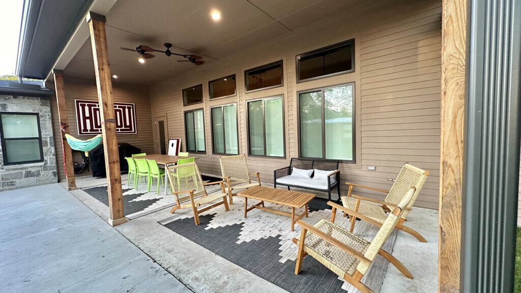 Welcome to Gameday Getaway, a modern 3-bedroom, 2.5-bath home in the heart of Aggieland. Feel at home in this newly built retreat that offers sleek design and comfortable living. This home features a fully equipped chef’s kitchen with stainless steel appliances and seating for six at the island, a retro-style dining table, and a spacious living room with a large TV. Enjoy the landscaped backyard with a fire pit, ample seating, and a gas grill. This home offers unbeatable convenience—just a short walk to Texas A&M University, Kyle Field, Northgate, and Century Square. It's also within walking distance of Northgate nightlife and Century Square shopping. Nearby favorites include Kyle Field (10-minute walk), Northgate (restaurants, bars, and live music), and Century Square (shopping, dining, and entertainment). Smoking is not allowed in or on the property. If there is any evidence of smoking, $400 will be retained to deodorize the home. Do not turn the thermostat below 69 during the summer as the unit could freeze, and you will be charged the cost to repair the heating/cooling system. When leaving in the summer season, turn the thermostat up to 80 degrees. When leaving in the winter season, turn the thermostat down to 60 degrees. People other than those accounted for in the booking agreement may not stay overnight in the property. If unauthorized guests have stayed, a fee of $300 will be retained plus $25 per person. Pets are not allowed at Gameday Getaway. If a pet is found on the property, a pet fee will be charged and the booking may be terminated. All trash must be bagged when placed in a dumpster, or there will be a $20 charge. [SI]