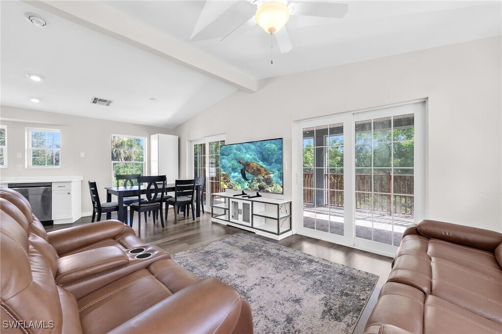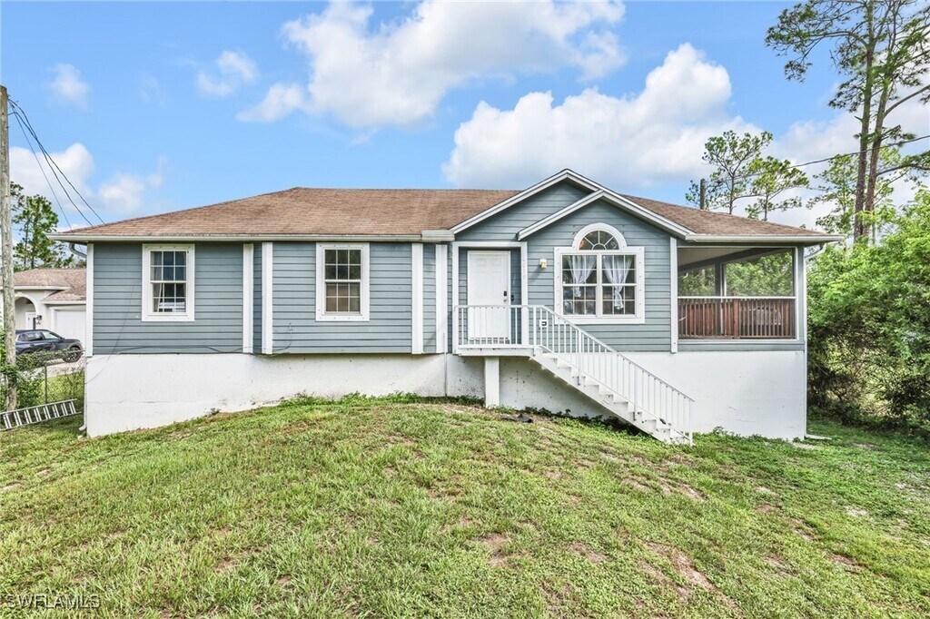 Step inside this elevated 3-bedroom,2-bath home built in 2018 and feel the openness immediately. Vaulted ceilings and an open-concept layout make everyday living and entertaining effortless,whether you’re keeping an eye on the kids or hosting friends. The kitchen features stainless steel appliances,quartz countertops,and modern finishes throughout,with a washer and dryer included for a seamless move-in. From the living area,sliding doors open to a screened,covered lanai balcony—the perfect spot to enjoy your morning coffee or unwind in the evenings while overlooking the peaceful surroundings. Beneath the home,the elevated design provides generous covered storage for outdoor gear or seasonal décor. Set on a 1.14-acre lot,the property blends open yard space with natural wooded areas and hedges for added privacy. Located in Golden Gate Estates,this home offers quiet privacy with convenient access to daily essentials. Palmetto Elementary is 4 miles away,Cypress Palm Middle is 6 miles away,and Publix is only 7 miles away.