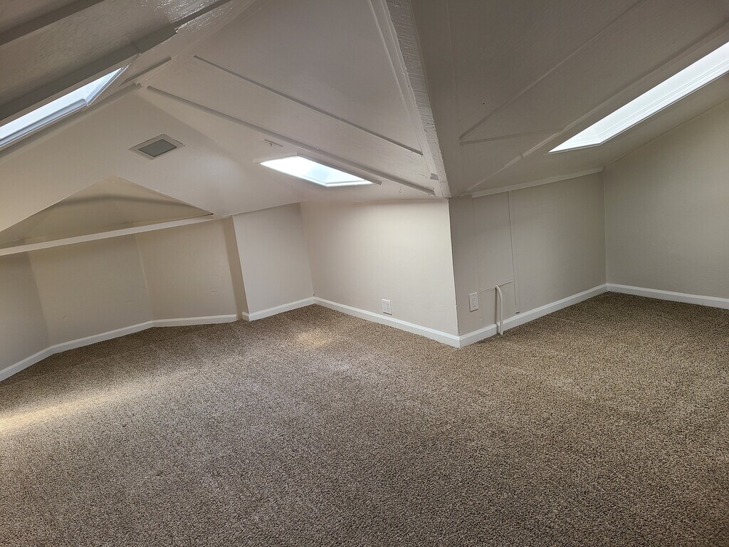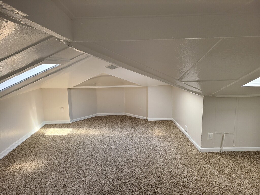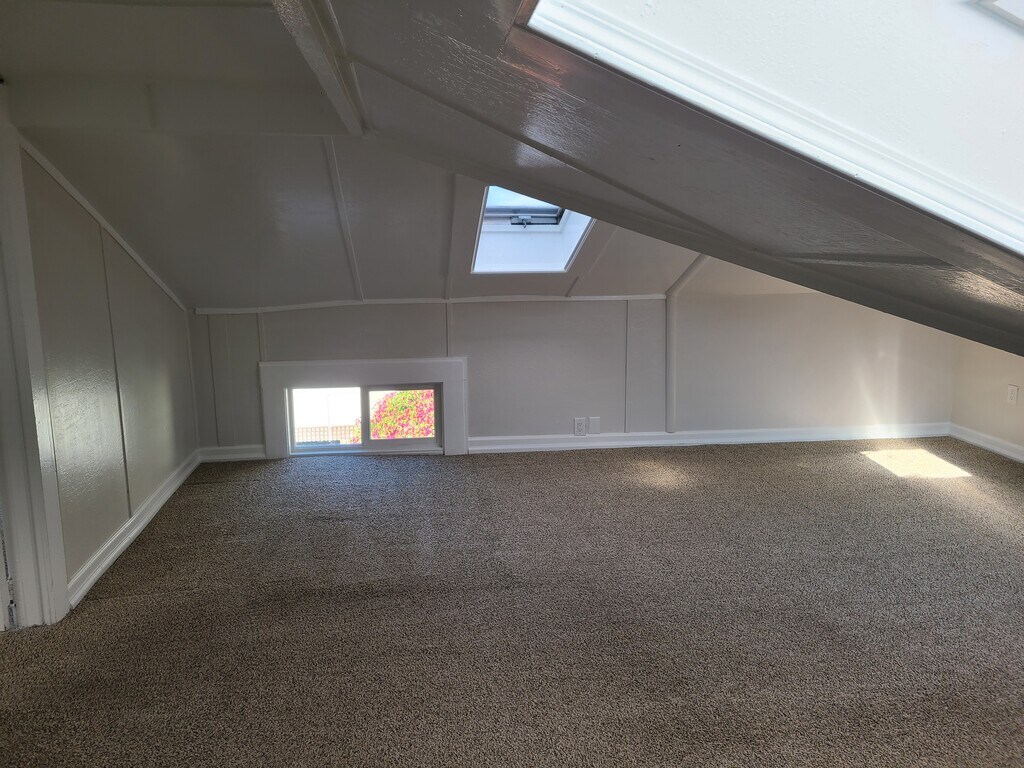 This unit is the upstairs unit of a duplex. It is one of a group of houses located on secure and garden oasis within Emeryville. We are a stable and Gated long-term community of creative dynamic working professionals. The property consists of two old Victorians, a renovated carriage house and a vintage four plex. It was once part of a large cherry orchard estate and still has an old-world charm. You can drive in, enjoy small colorful community of close-knit neighbors, gardens, gathering areas and leave the chaos of the city behind. The newly painted and partially renewed carpeted 1331sq ft apartment for rent has two bedrooms and an office offering windows, skylights and lots of natural light and one tiled bathroom. This unit has lower ceilings (about 6'4"0 that follow an angular roof line (see photos). Enjoy your morning coffee or evening glass of wine on the 140 sq ft deck over looking all the gardens or at one of the outdoor fireplace gathering areas around the property under a variety of beautiful trees and pergolas and nestled in beautiful gardens. There is a beautiful, large, built in out door barbecue that we have Friday afternoon get togethers at every week. New carpet and paint. Kitchen has a Bosch dishwasher, and a Wolf 36" commercial range with griddle, LG refrigerator and a garbage disposal. Renovated for energy efficiency double pane windows, gas fireplace heating and an on demand hot water heater. FREE on-site laundry and off-street parking. FREE high-speed internet (WEB PASS). Bike storage, extensive grounds and gardens, sitting and picnic areas. Set back off the street for quiet living. This apartment is available for rent January 1st. This apartment is near Arizmendi, Pixar and walking distance to a host of other shops and restaurants. The free Emery-go-round stops nearby to take you to work, shopping, and BART. We are walking distance from MacArthur BART station (10 mins) and all major bus lines to the city and East Bay (1 min). You can live here without using your own transportation. There is however an included parking spot on the secure property and off the street for this unit. Each applicant must meet these requirements: Good credit and references are required. Income must be 3x rent, no past evictions, verifiable income, and positive rental history. No smoking on property or in units. This property is a space is an inclusive space for community, respect for our neighbors within our community, quiet living and no loud parties. On site manager takes care of all repairs. Water, Garbage, and internet are paid. $2500.00 deposit.