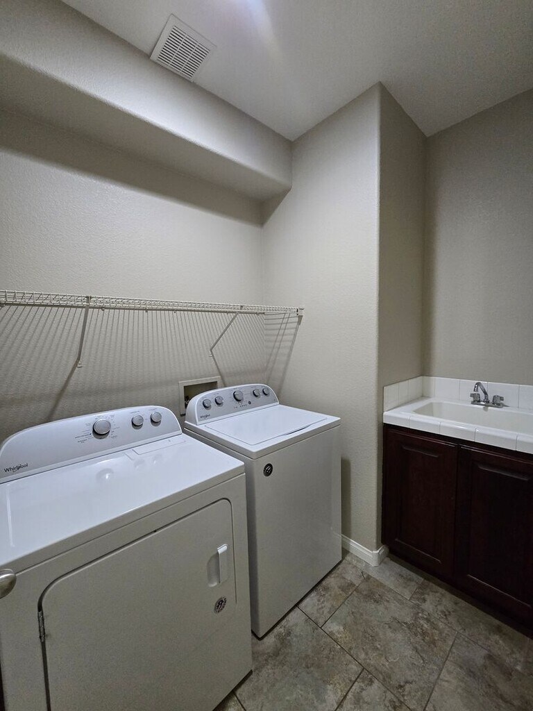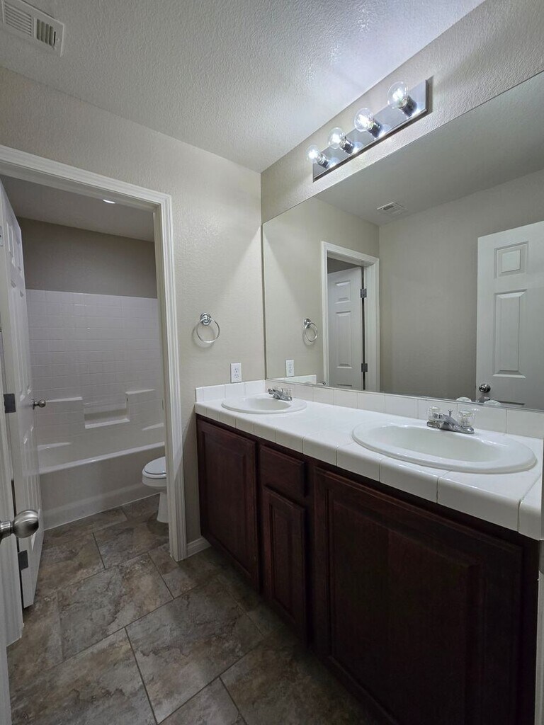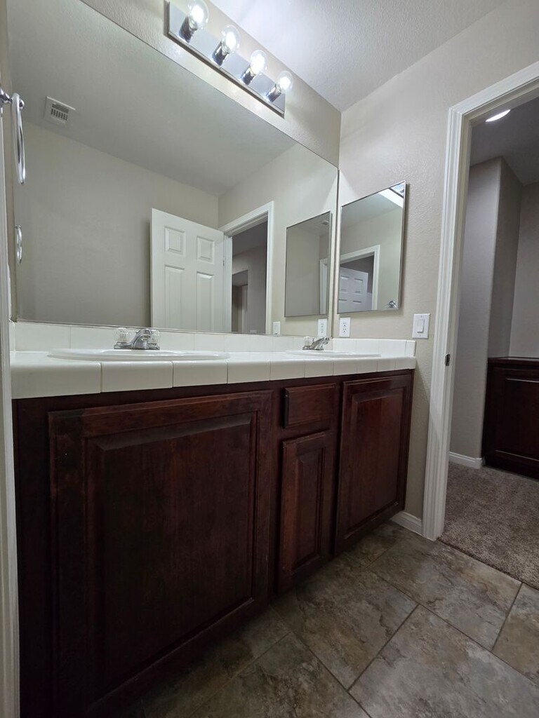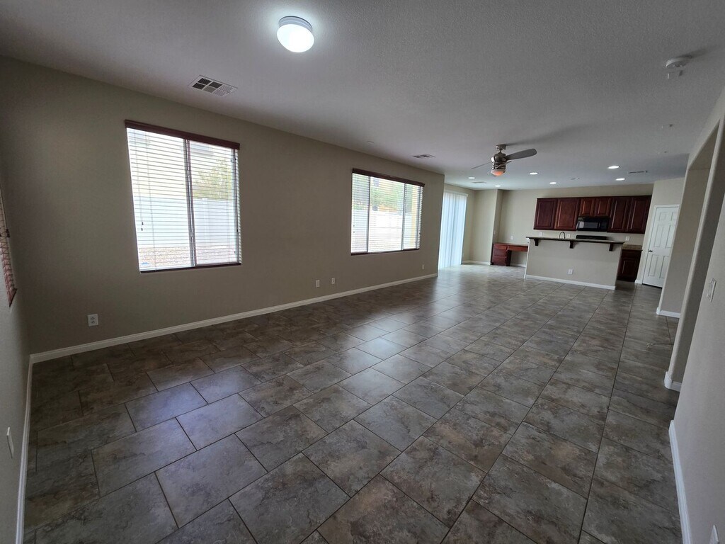 Spacious 5-bedroom, 2.5-bath home with a 3-car tandem garage. Step inside to find formal living and dining rooms with tile flooring, leading to a bright family room and open kitchen with an island breakfast bar, granite countertops, all appliances included, and a walk-in pantry. The kitchen and dining areas also feature tile flooring for easy maintenance. Upstairs, the primary suite offers a ceiling fan, a walk-in closet, dual sinks, a makeup vanity, and a separate tub and shower. Four additional bedrooms provide plenty of space for family or guests. The backyard includes a patio and ample room for entertaining or relaxing. Low-maintenance landscaping. This is a wonderful home with room to live, work, and play. Note that the Rent includes a $50 monthly charge for the Resident Benefit Package. For more information, please call .