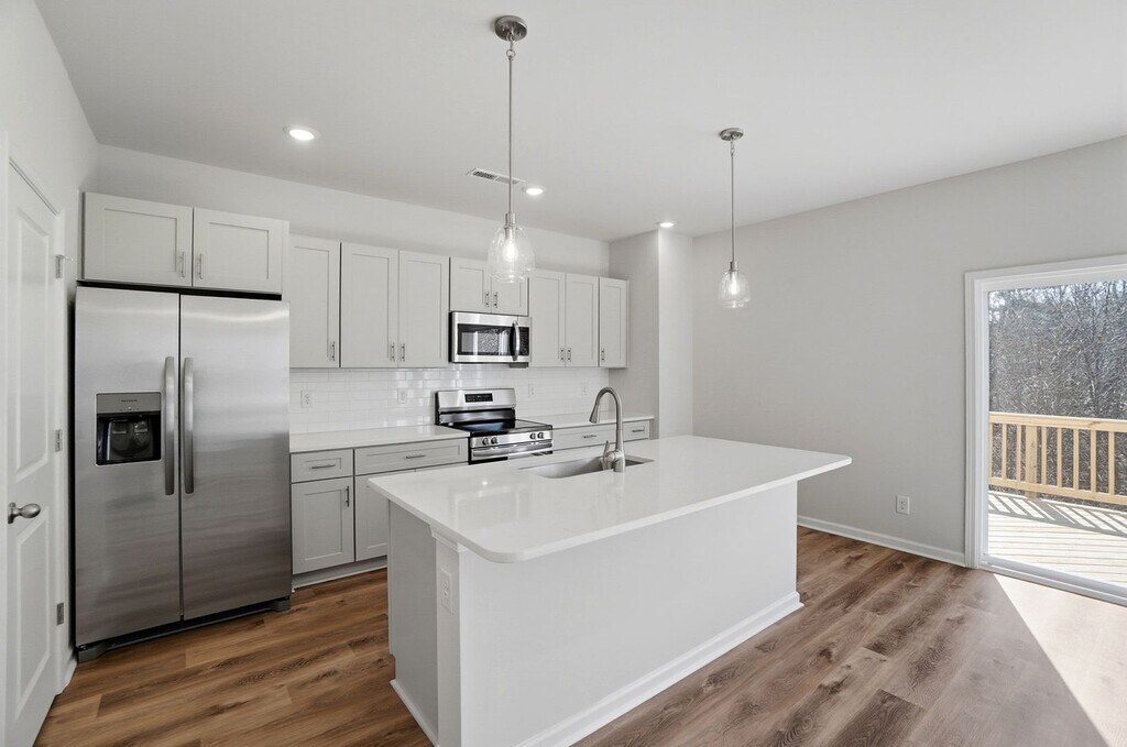 Be the first to live in this beautifully crafted Willow plan in the brand-new community of The Pines at Paw Creek. This 4-bedroom, 2.5-bath home with a 2-car garage offers a modern open layout, quality finishes, and thoughtfully designed spaces ideal for today’s lifestyle. A welcoming foyer opens into a spacious living area where durable LVP flooring and an open-concept design create a seamless flow from the kitchen to the living room and out to a stunning elevated back deck. From here, you’ll enjoy a peaceful, private view overlooking the natural area behind the home. The kitchen truly stands out with shaker-style soft-close cabinetry, quartz countertops, a large center island perfect for bar seating, tile backsplash, and stainless steel appliances. Upstairs, all four bedrooms are thoughtfully positioned, including a spacious primary suite featuring a tray ceiling, walk-in closet, and a beautifully finished en-suite bath with dual vanity and tiled shower. The secondary bedrooms are generously sized and share a well-appointed full bath. A versatile loft area sits between the bedrooms, offering flexible space for a home office, playroom, or additional lounge area. The upstairs laundry room includes a washer and dryer for added convenience. Located in a growing new construction neighborhood with easy access to Charlotte, this never-lived-in home offers the perfect blend of style, function, and comfort.