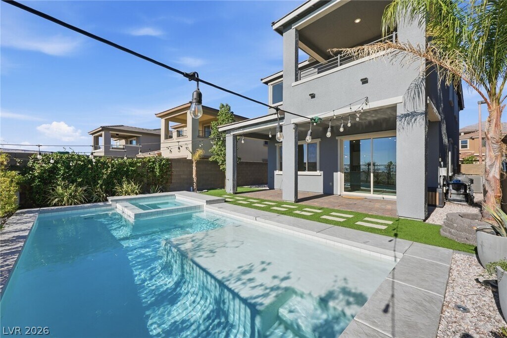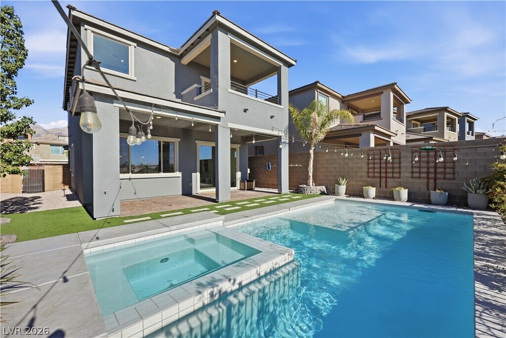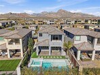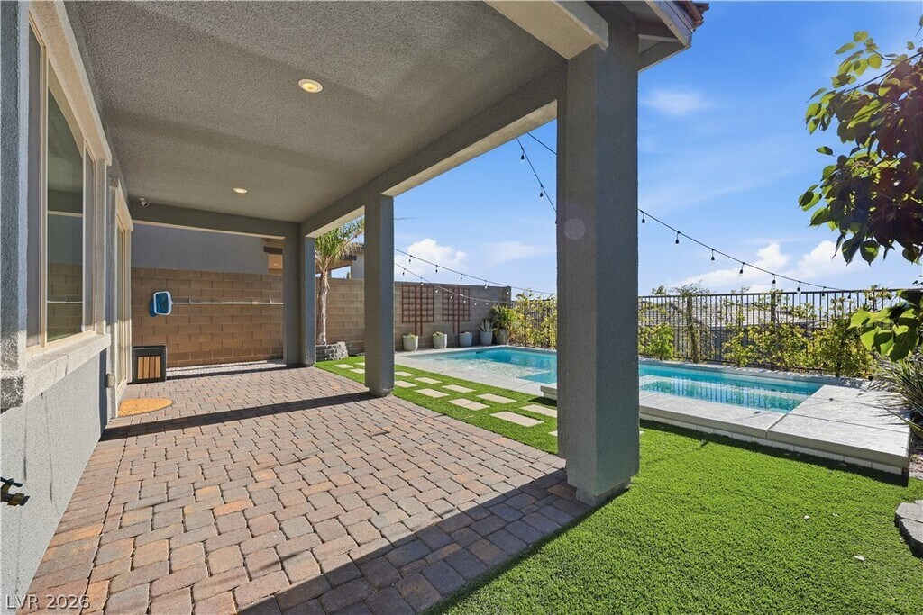 Luxury saltwater pool home in the gated Stonebridge Summerlin community of Bristle Vale just in time for pool season! Elevated lot with beautiful city views and resort-style backyard featuring a large saltwater pool and spa with swim deck, perfect for in-pool loungers, perimeter bench seating, and smart AquaLink system. Full-length covered patio perfect for outdoor entertaining with gas BBQ stub. Spacious 4-bedroom home plus loft with high ceilings and modern finishes throughout. Gourmet kitchen with waterfall-edge quartz island, double ovens, and separate cooktop. Primary suite features a private balcony overlooking the city. EV charger in garage and new washer & dryer included. Located near top shopping, dining, Red Rock Casino, and Red Rock Canyon. Adjacent to the prestigious Doral Academy Red Rock campus. Weekly pool service and monthly landscape service included in rent! Sewer & Trash also included. Apply now for the benefit of an entire pool season!