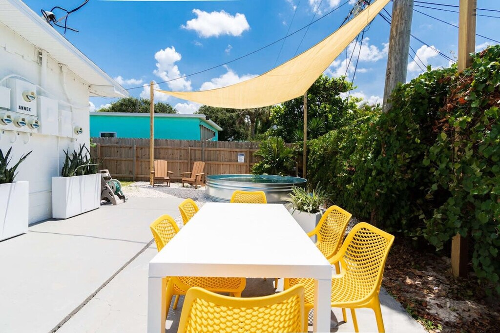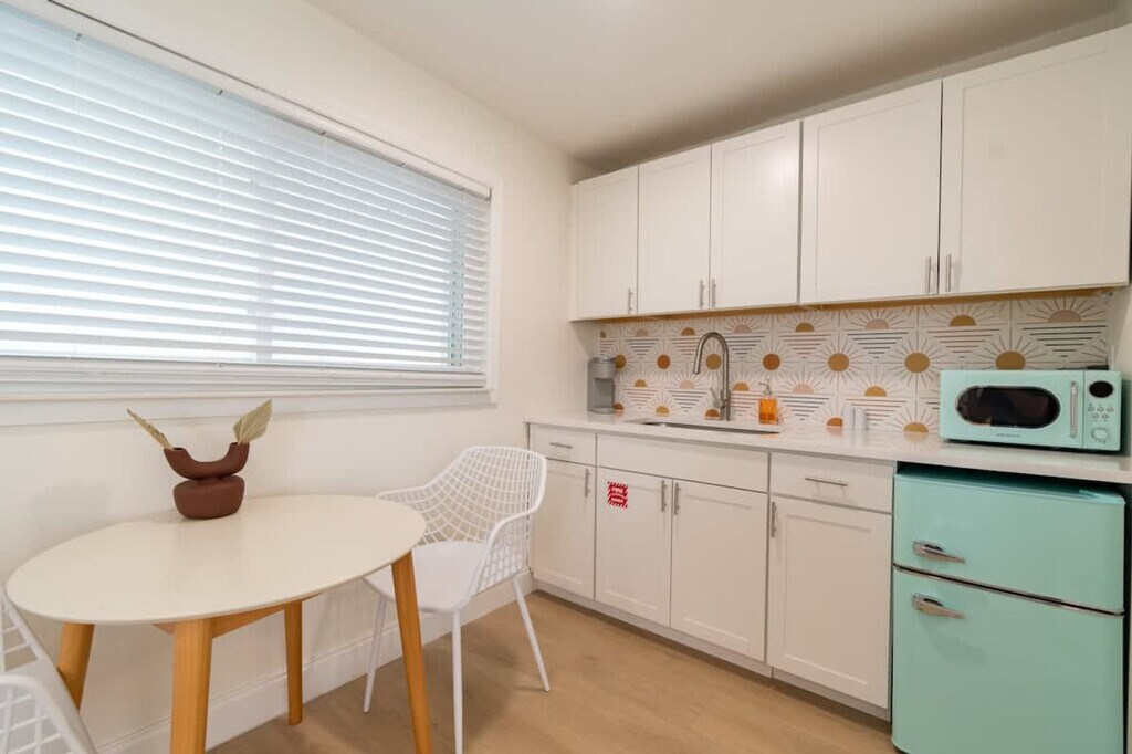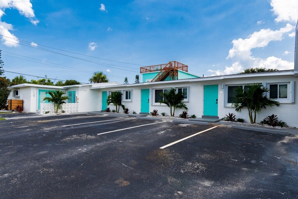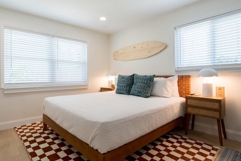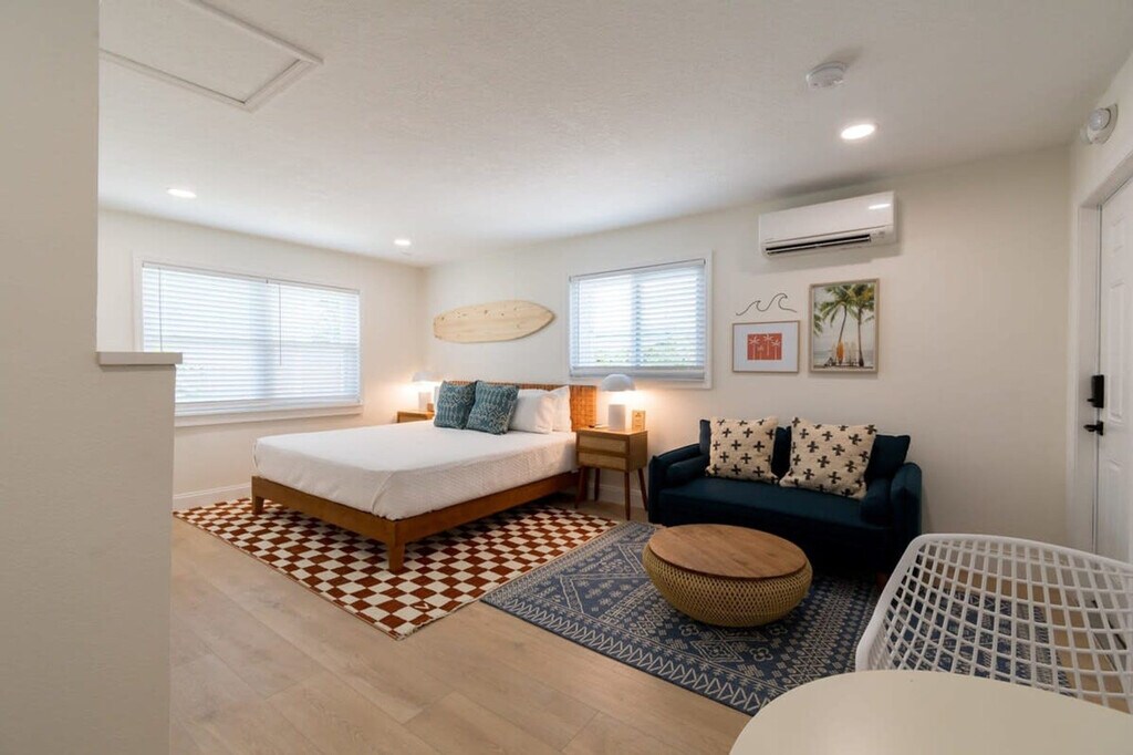 Welcome to this renovated studio apartment in a 7-unit complex in the heart of Cocoa Beach, just steps from the sand. Enjoy the on-site pool and make this design-forward studio your perfect home base for a beach vacation. This studio space features a kitchenette and a king-size bed, offering a comfortable stay. Located just steps from the beach, in the heart of Cocoa Beach, you can walk to restaurants, nightlife, cafes, and yoga studios. Enjoy access to a shared pool and patio area, all within a design-forward concept and fully equipped for your comfort. While we love all furry friends, only dogs are allowed at this property with a fee of $100 per pet per stay. Nestled in the heart of Cocoa Beach, this apartment offers the perfect blend of beachside bliss and vibrant coastal living. Embrace the surfing lifestyle with easy access to golden sands, renowned surf breaks, and epic rocket launches. Cocoa Beach caters to everyone, whether you're a seasoned surfer, sun-seeker, or exploring with family and friends. Discover the lively local scene with a variety of dining options, quirky shops, and laid-back beach bars. Enjoy fresh seafood delicacies or sip on a tropical cocktail as the sun sets. For outdoor enthusiasts, the area offers paddleboarding, kayaking, and fishing in the calm waters of the Banana River or the Atlantic's thrilling waves. Explore the trails of Canaveral National Seashore, home to abundant wildlife. Located just a short drive from Orlando, this apartment is an ideal base for exploring the famous theme parks and attractions. After an action-packed day, return to the tranquility of Cocoa Beach and enjoy breathtaking coastal views. To ensure a comfortable start to your stay, an initial stock of essentials like paper towels, toilet paper, tissues, coffee pods, creamer, sugar, light cleaning supplies, garbage bags, sponges, dish soap, and dishwasher tabs is provided. If you need additional supplies during your stay, please plan to replenish them as needed. Mailbox access is not available for guests. A refundable security deposit or the purchase of a damage waiver is required for all reservations. [SI]